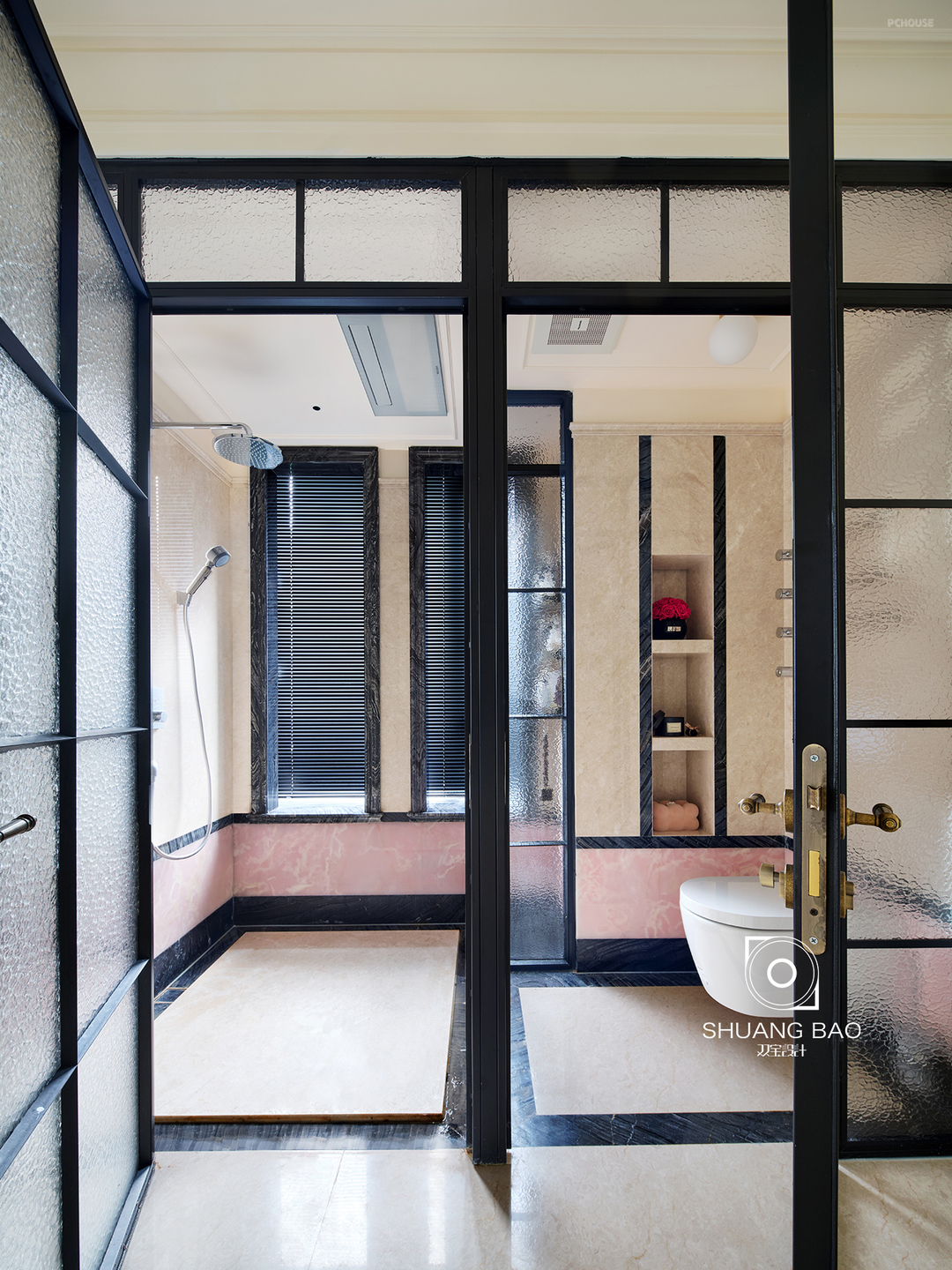 此处连接卫生间与主卧,经典的老钢窗双开门勾勒出精致典雅的仪式感,一黑一白的配色划分不同空间,通透的水纹玻璃让光线自由穿梭,过道处通透明亮