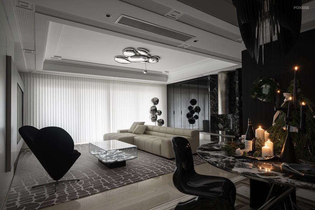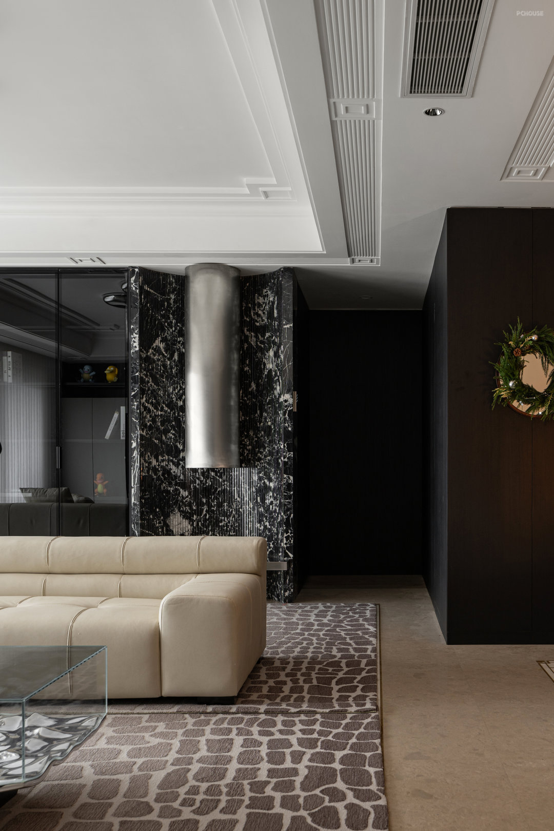 整个客厅以暗黑系的潮酷基调,开启一场与五感碰撞的全新体验。设计师透过简练的笔触来表达克制平衡之道。通过地毯与沙发的围合,框出空间的功能区隔,既可满足家里每位成员的独立需求,又实现了彼此串联。