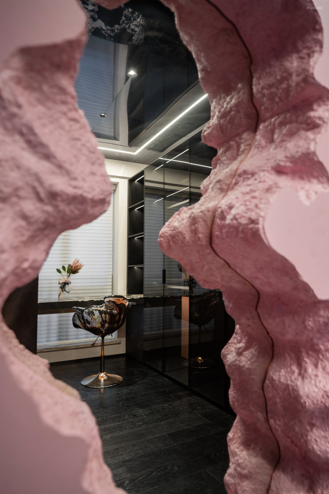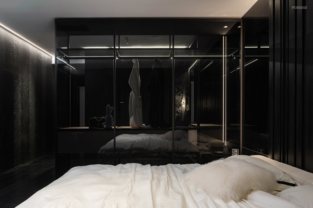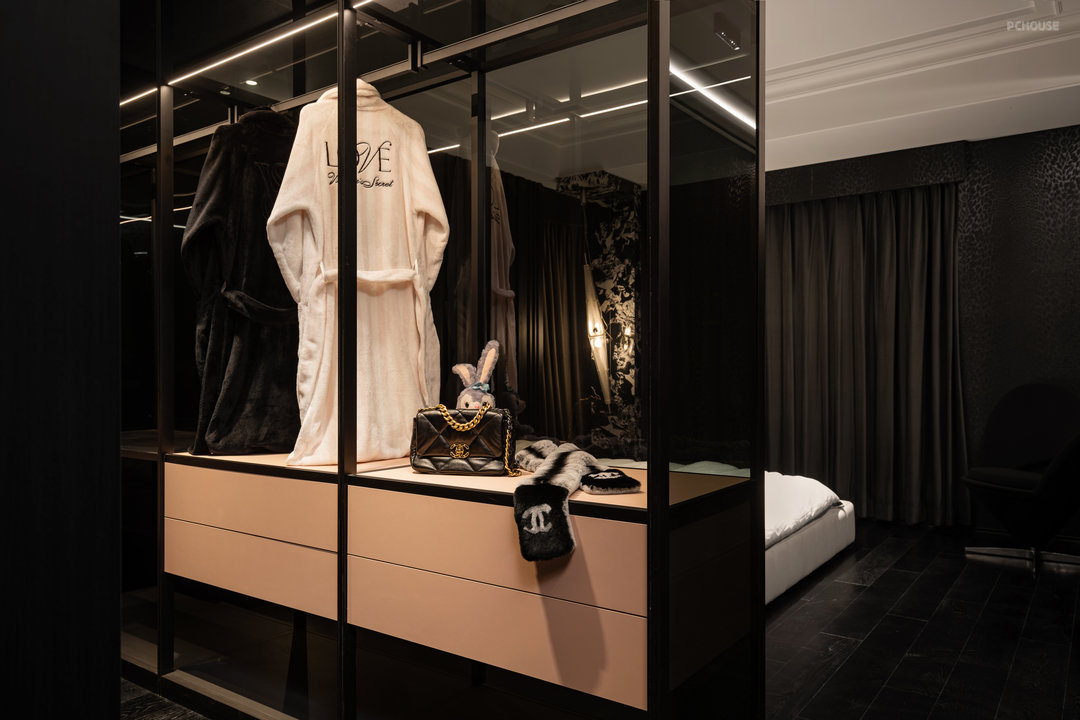 卧室延续黑色的色彩主调,通过相同的材质、色彩与纹理,去强调空间整体的统一。在装饰的选择上,发配粉色的衣柜背板,搭上黑色豹纹壁纸,去突出色彩与结构对视觉的冲击感,女王范儿十足。
