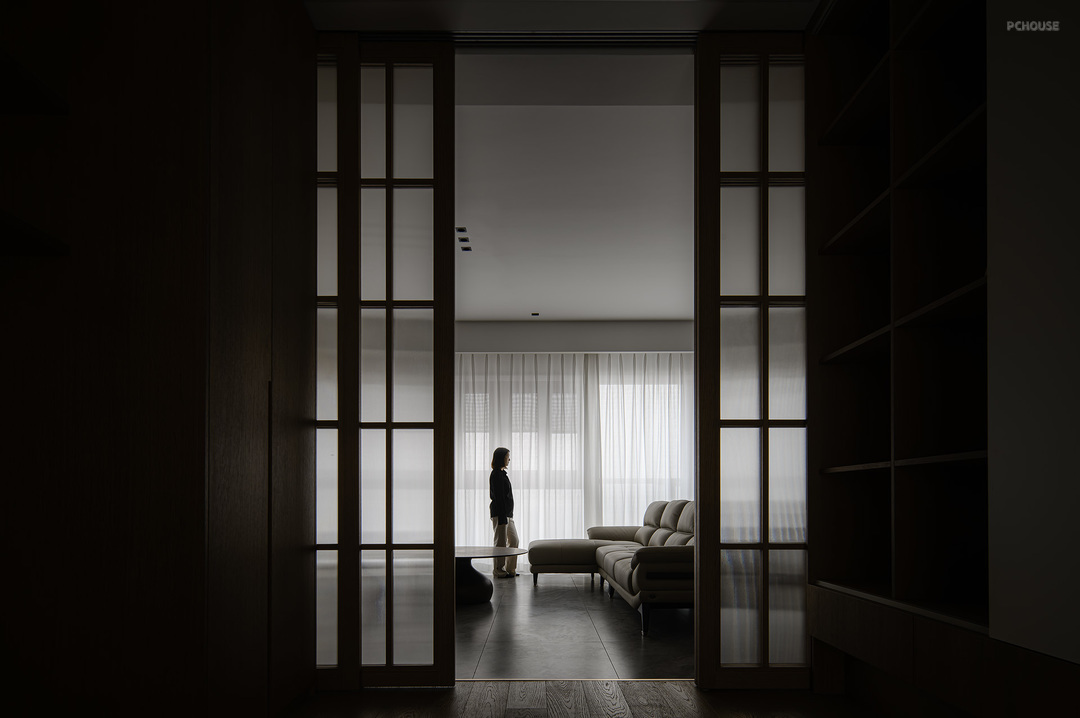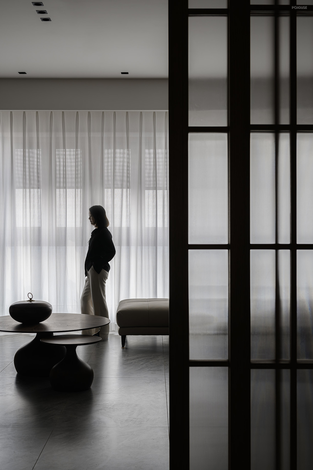 客厅采用开放式布局,将书房或茶室置入其中,扩大空间视野。书房做了四扇推门,开合之间,形成微妙联动,同时保证空间的封闭独立。透光不透影的推门,视觉上也会更加轻盈。