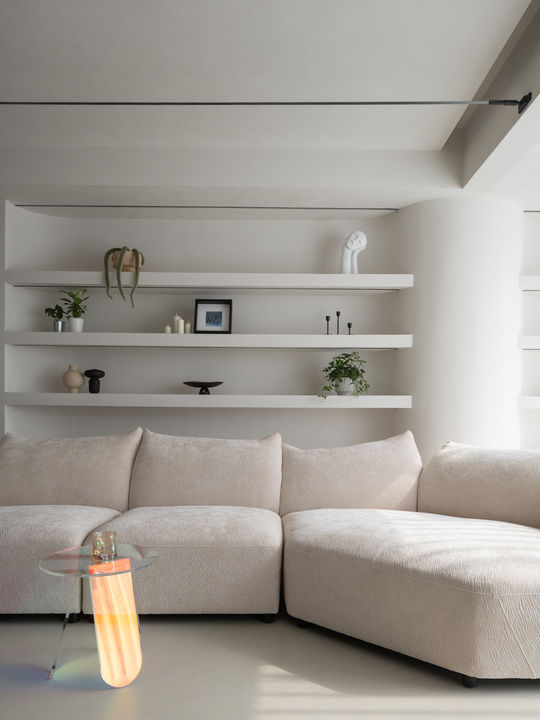 在整个客厅的区域里,我们可以看到大大小小的体量分布在一个整体的空间中,完美的融合进这个载体中,这些大小不等的生命力在这里碰撞交织,似乎也在演绎一场全新的生命篇章。