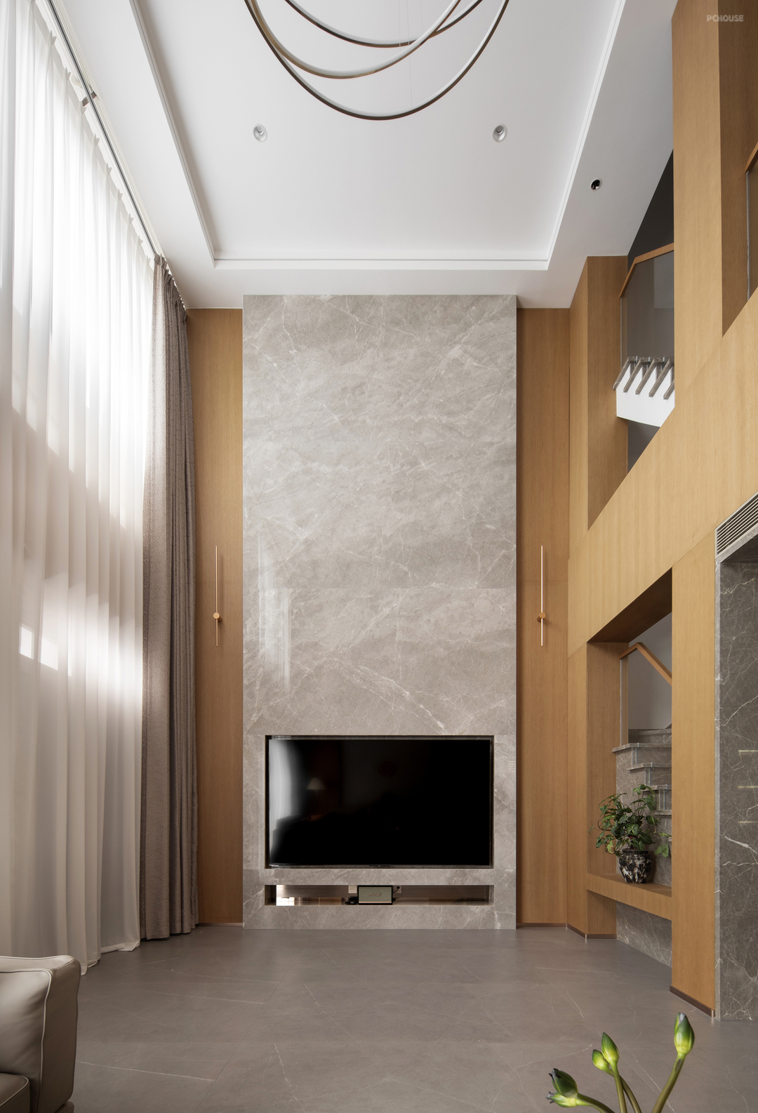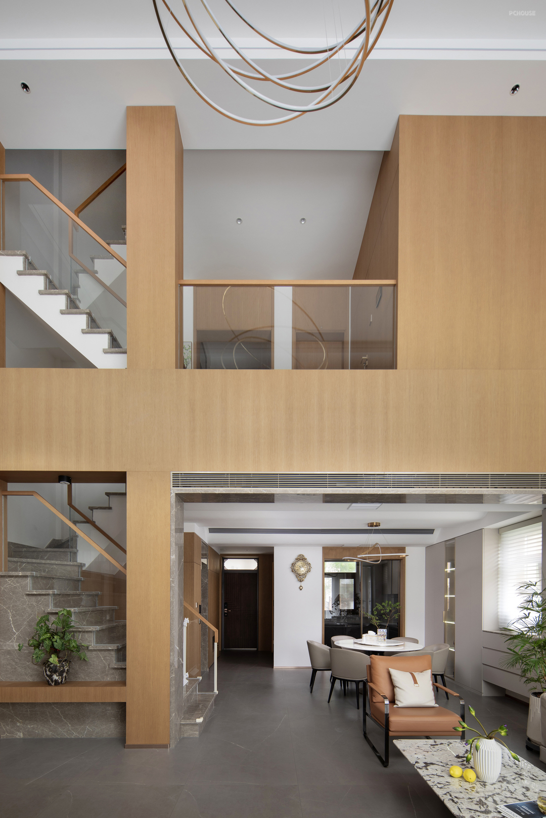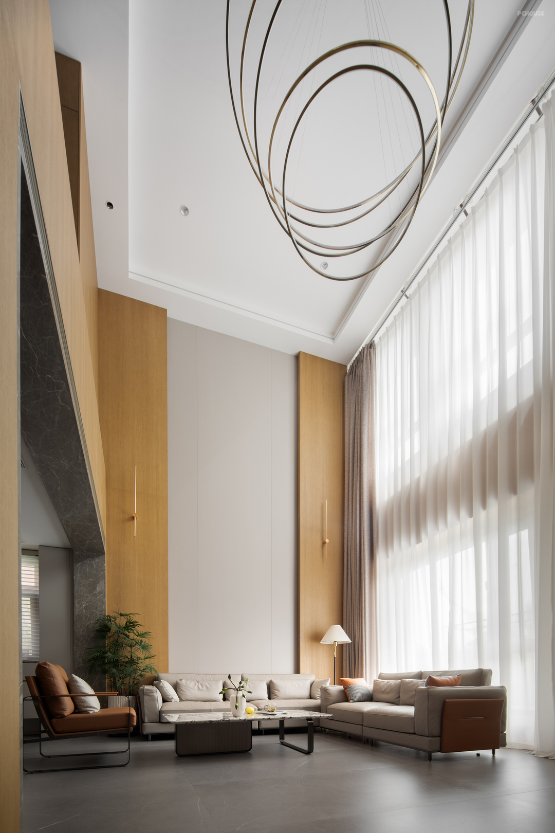 ○ 环形大吊灯成为整个挑空空间的点睛之笔,挑空6米多的层高,拉伸了纵向的空间感,让整个空间看上去既开阔又气派。