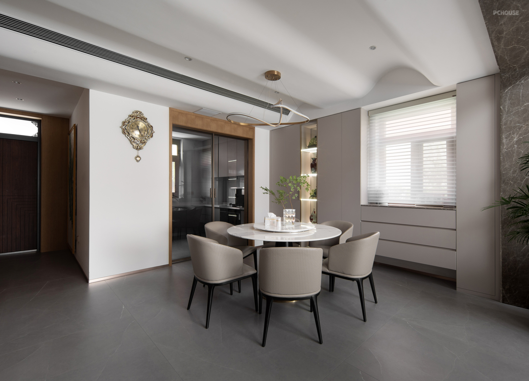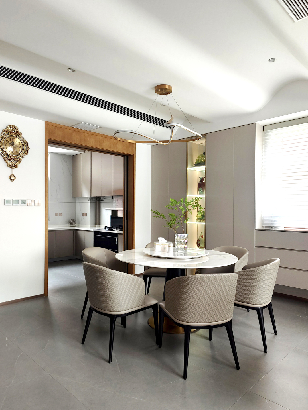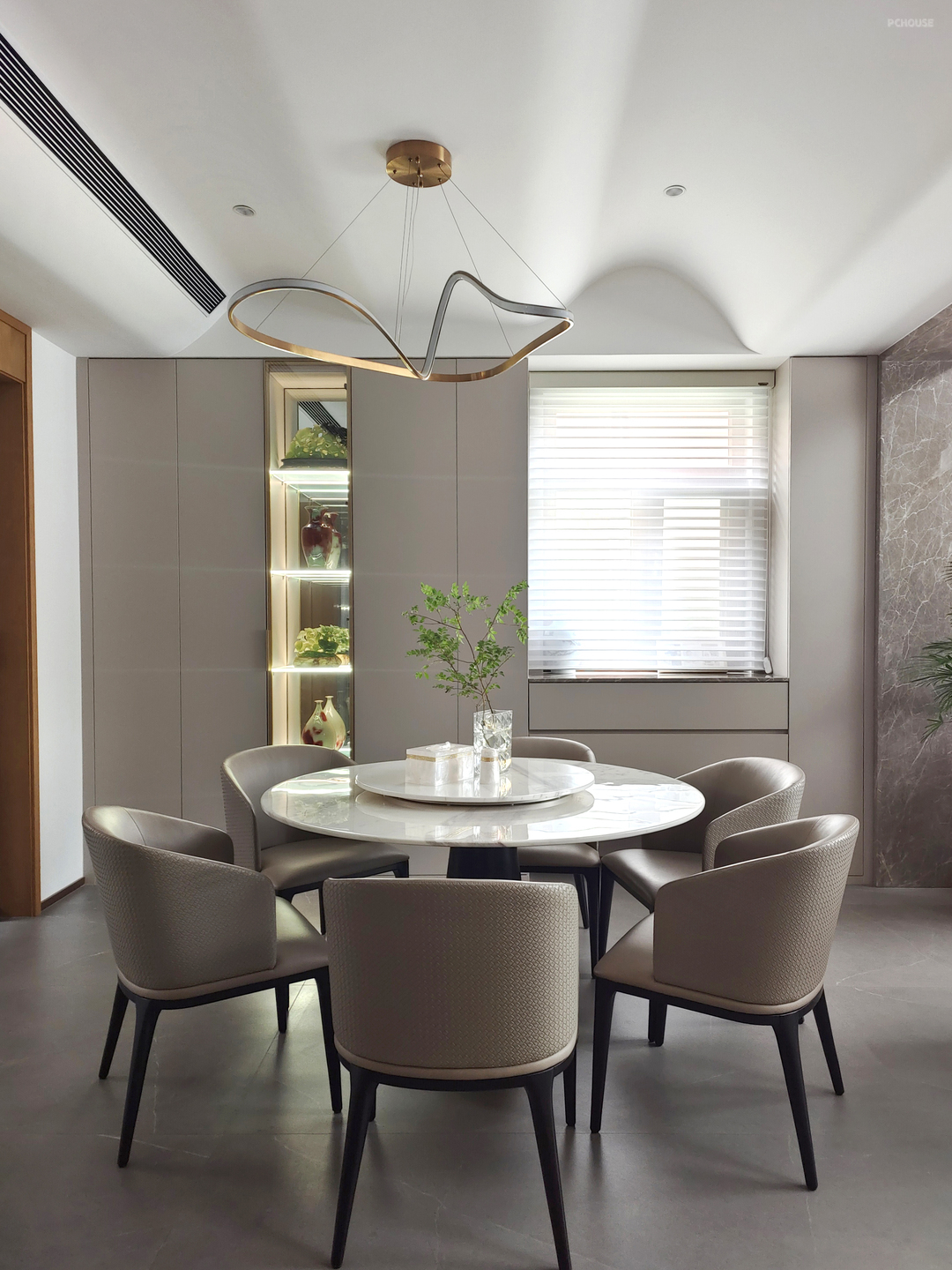 ○ 餐桌岩板圆润的弧度与顶面的曲线造型相得益彰,婉转富有情调。
