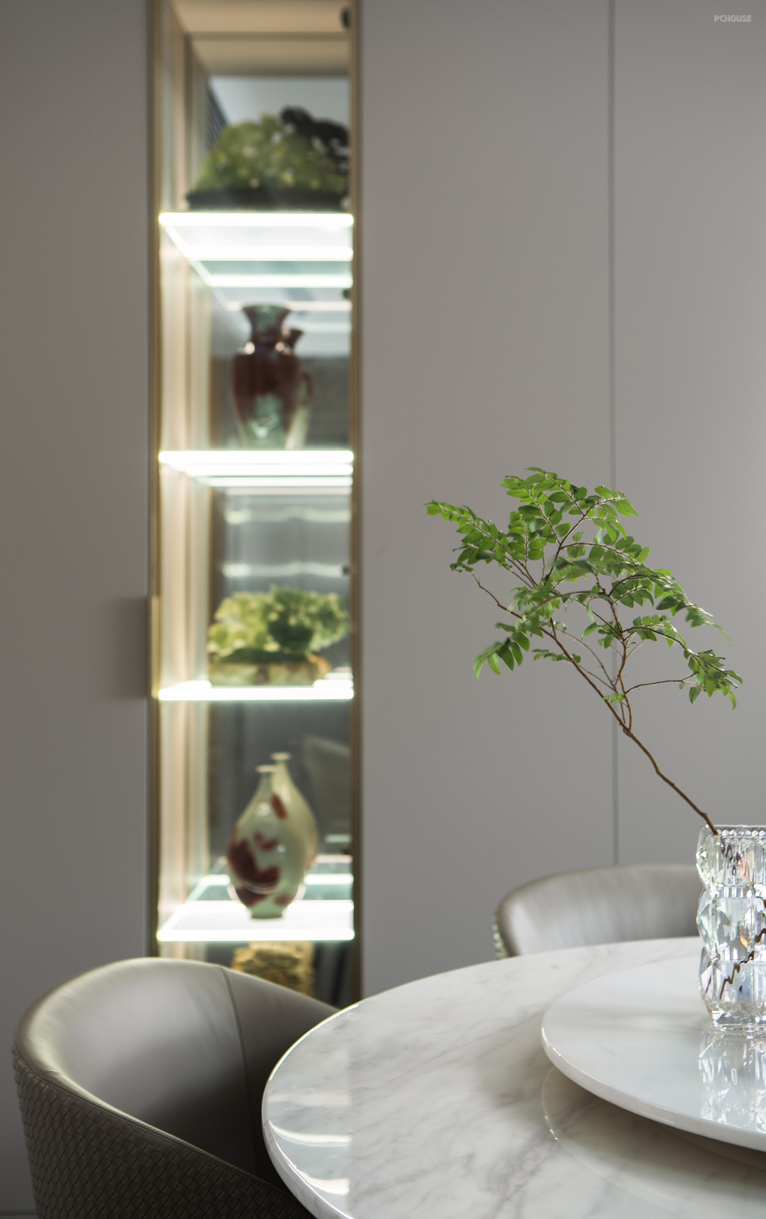 ○ 餐厅靠墙区域打造沿窗边柜,窗下三个大抽屉,满足各种小物品的收纳,窗户两侧做通顶柜子,搭配玻璃柜,既精致又富有变化性和层次美感。