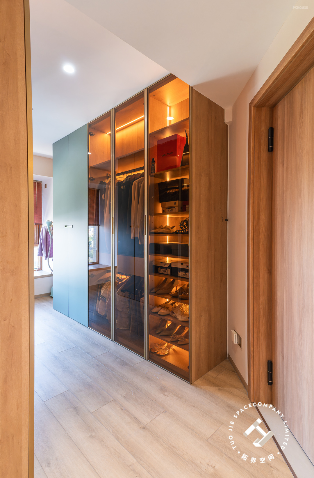 墨绿色的衣柜给衣帽间奠定了新潮的时尚感,棕色玻璃柜门加上内置的暖灯带,散发出浪漫的复古氛围,冲击着我们的视觉神经。