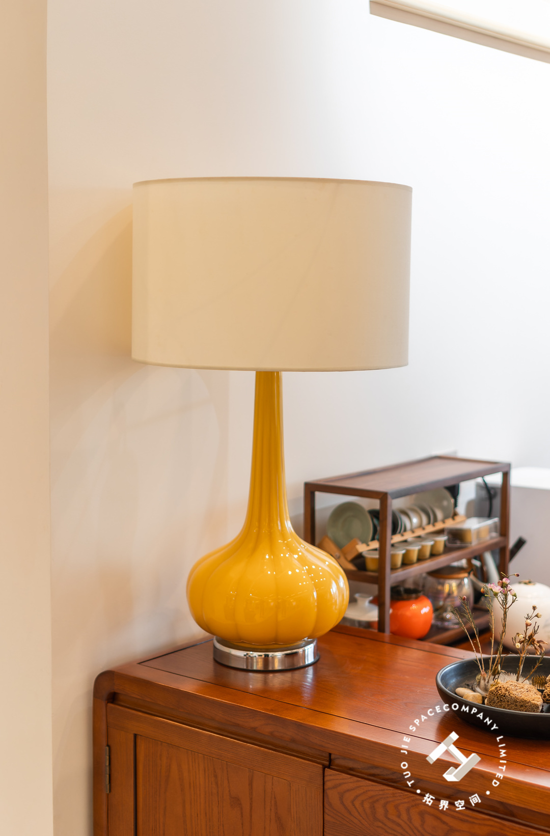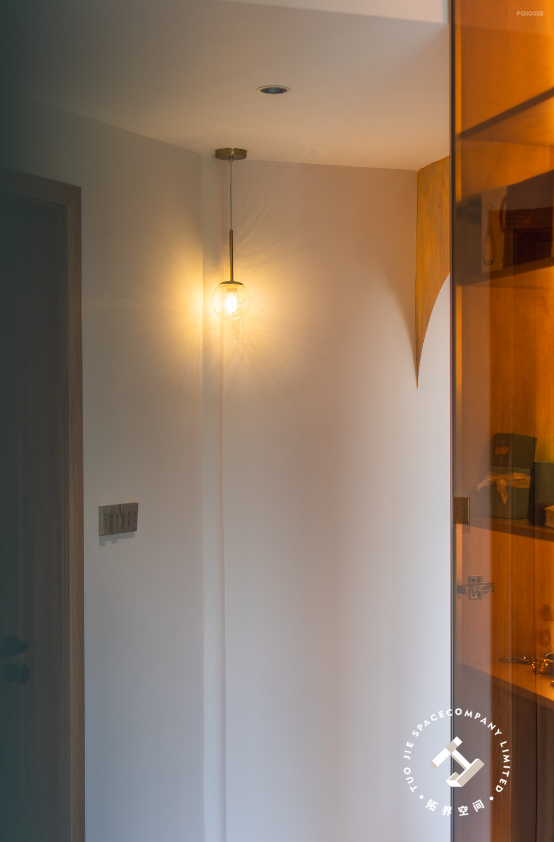 卧室转向衣帽间的过道上悬挂一束灯光,其内环绕的金丝,似在烘托这一抹光亮,营造了浪漫的氛围。