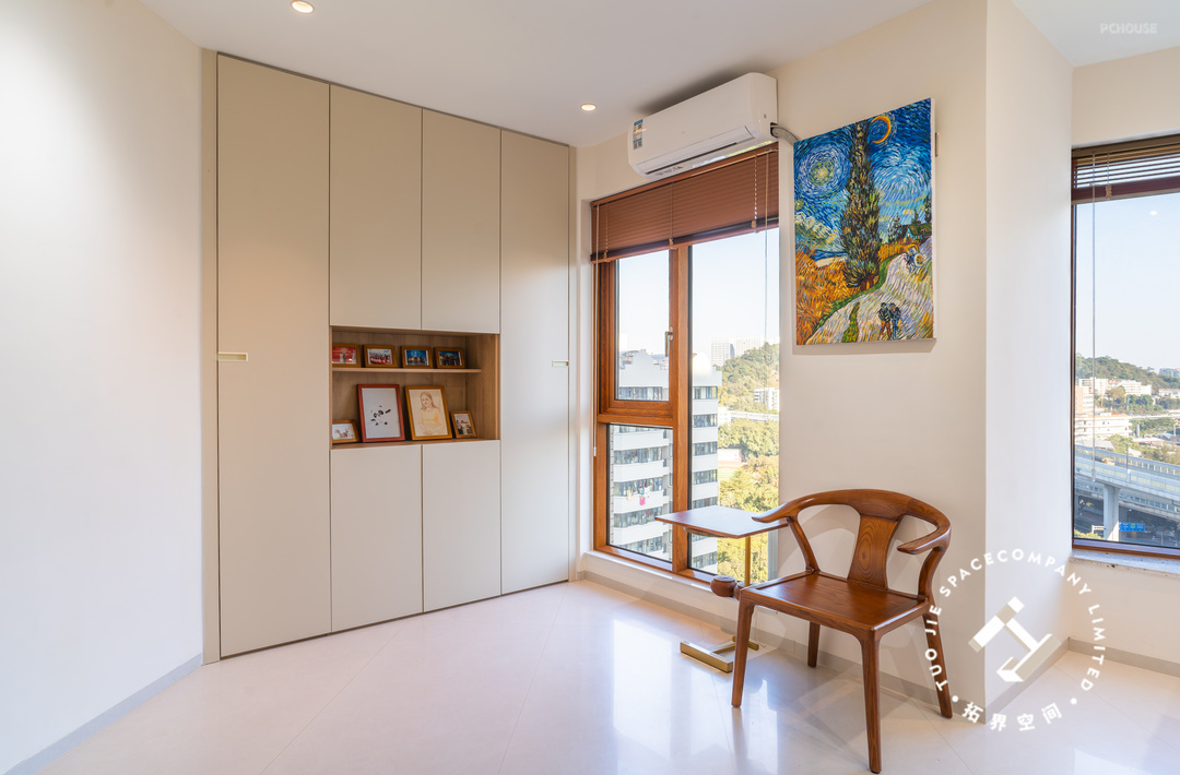 因为这间卧室是一个不规则的结构,所以在定制衣柜时,采用了斜切的手法,可以作为展示柜,同时视觉上也不会有突兀感,完美掩盖了畸形的角落。