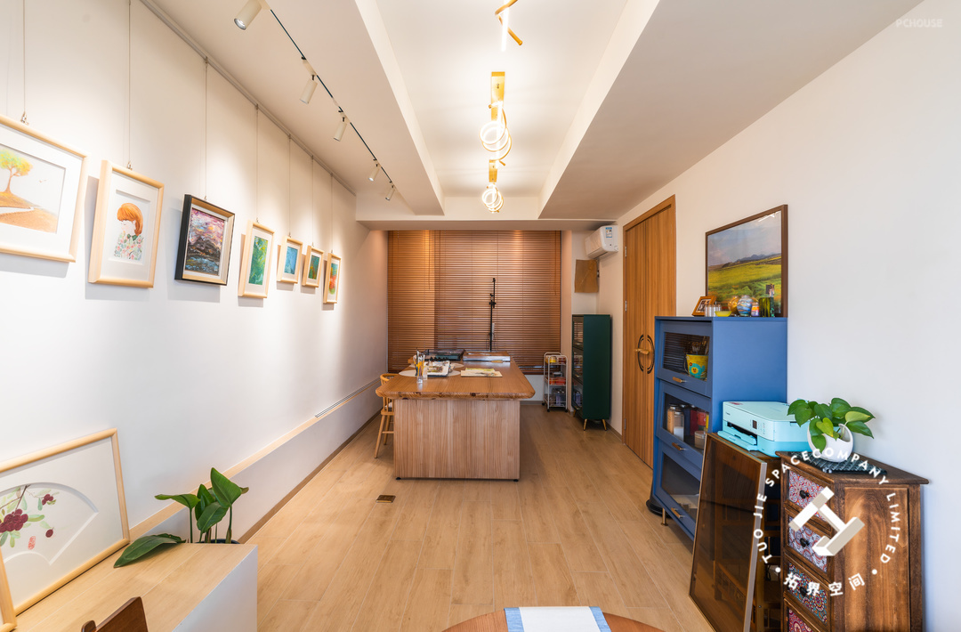 宽大的实木办公桌有着沉稳大气的风格,为空间注入了别样的生机,桌面摆满了绘画工具,每一道痕迹都记录着创作者在创作时的灵感与过程。