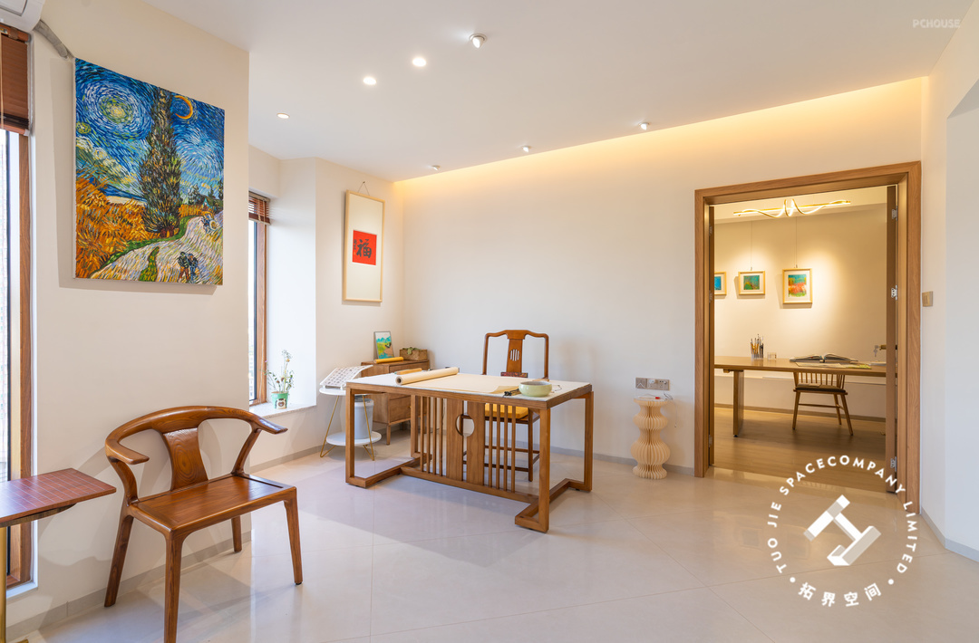 中式书桌和官帽椅的配置,桌面还摊开一张即将创作的宣纸,颇具一派水墨书香之韵,洋溢着自然的木香与人文的墨香。