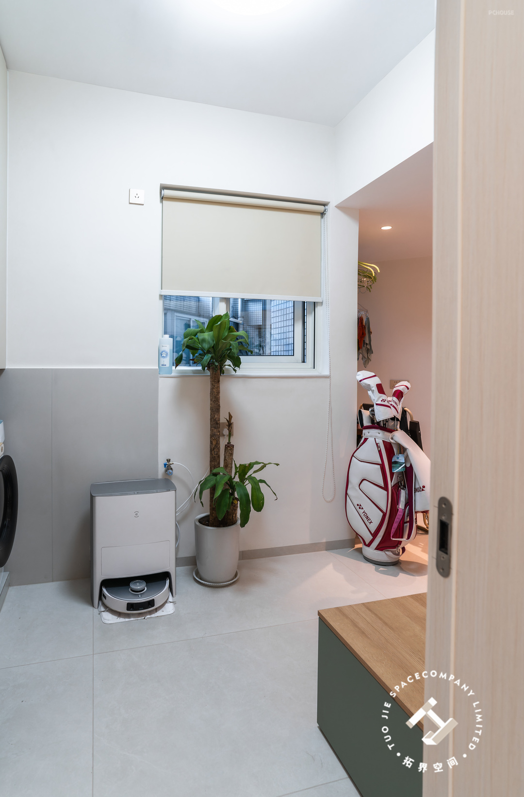 阳台不再是传统的晾晒区,而是家中的一个景观区,两侧的墙面用木格栅装饰,将自然绿意与象征吉祥的石像引入其中,似是进入后花园,古雅而幽静。