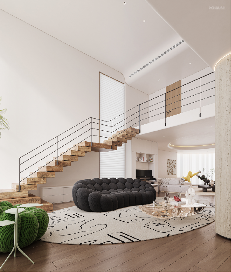 弧形的白色沙发落座柔软舒适,搭配圆乎乎的黑色小茶几,构成围合式的布局。与弧形的天花形成上下呼应,柔和空间的线条,延伸视觉空间,强化包裹感。