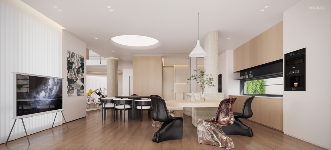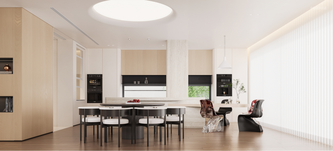 餐厅与西厨、品茗区相连,形成自然流畅的空间过渡。餐厅圆形的岩板餐桌搭配实木餐椅,增添了艺术的氛围。西厨封闭式吊柜+透明玻璃酒柜+多层抽屉储物,满足分区储物与美酒展示需求。弧形岛台扩充操作台面,满足多人备餐需求。