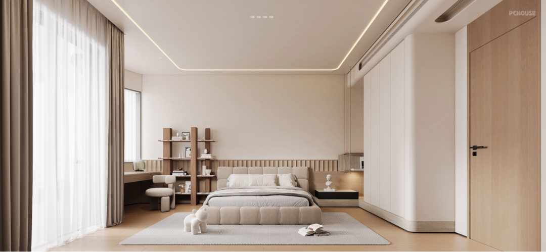 长辈房的弧形床头背景墙,弱化棱角柔和空间,空间设计感更强,增加美观性。窗边规划休闲区域,方便阅读或者小憩。