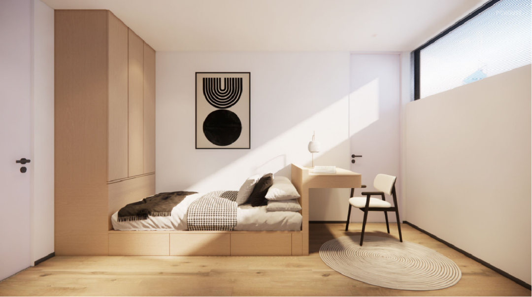 客房采用榻榻米组合床,床柜一体设计叠加顶部空间,不仅储物空间更充足,而且满足分区收纳的需求。床尾搭配书桌,可供灵活办公学习。