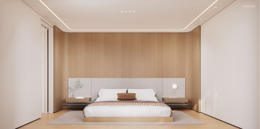 主卧的床头背景墙采用木饰面,加之温润的木地板,渲染一个温暖舒适的休憩空间。两侧设计悬空式床头柜,轻盈美观,兼具床头置物。