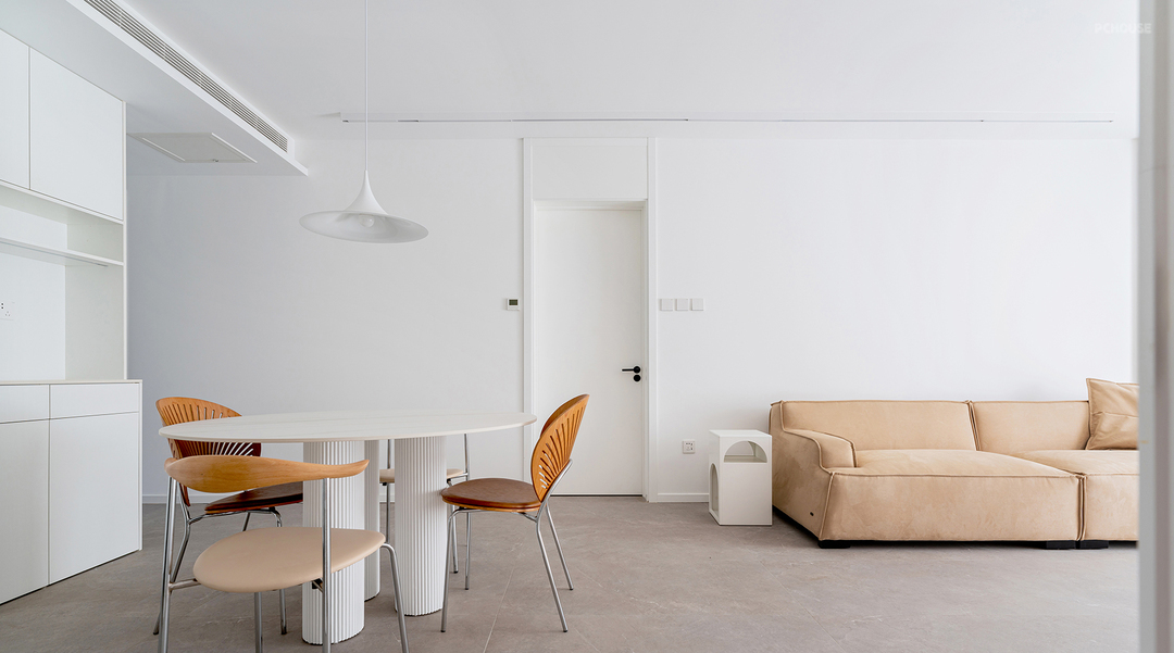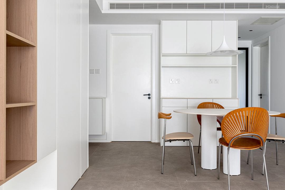 餐厅选用一张直径1.3m的圆形餐桌,与其他墙和柜留出适当距离,很好的优化了动线枢纽,去往其他空间更加便捷。