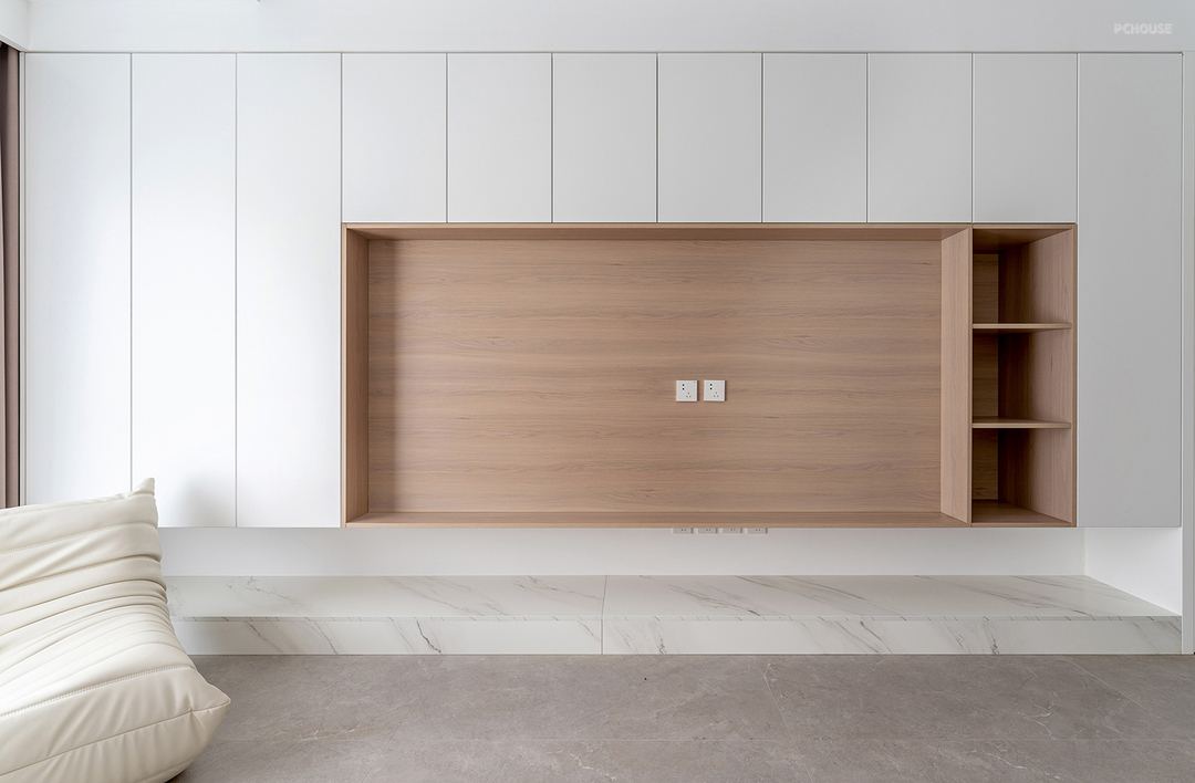 3.客厅定制满墙电视柜,并将卧室入口隐藏其中,隐形门也大大增强了电视墙的整体感。