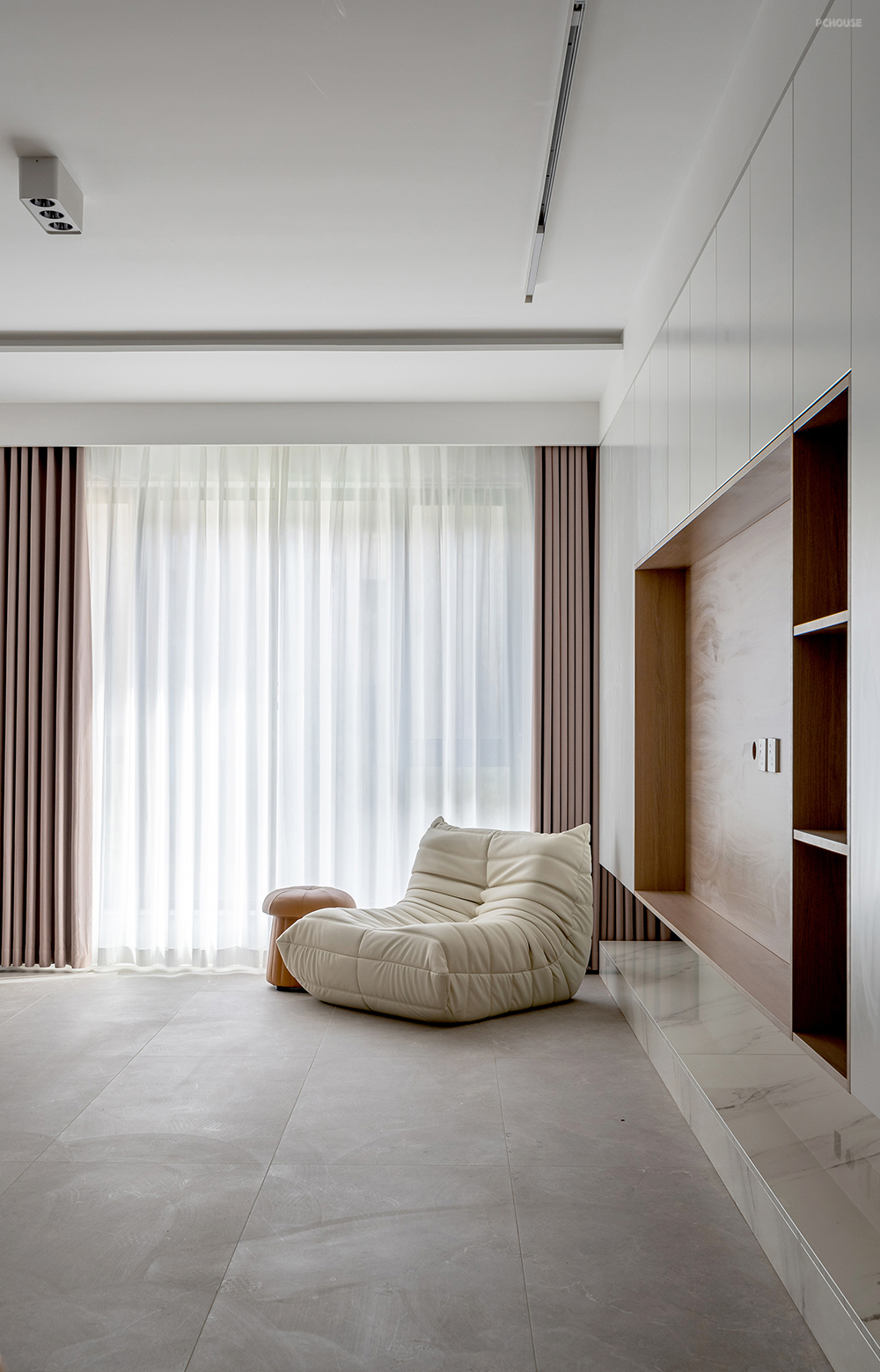 无主灯设计由嵌入式灯带、明装射灯、以及磁吸轨道灯组成,简洁的灯光布置。灯光与嵌入式墙柜组合在一个空间里,利落的线条感,显得恰到好处。