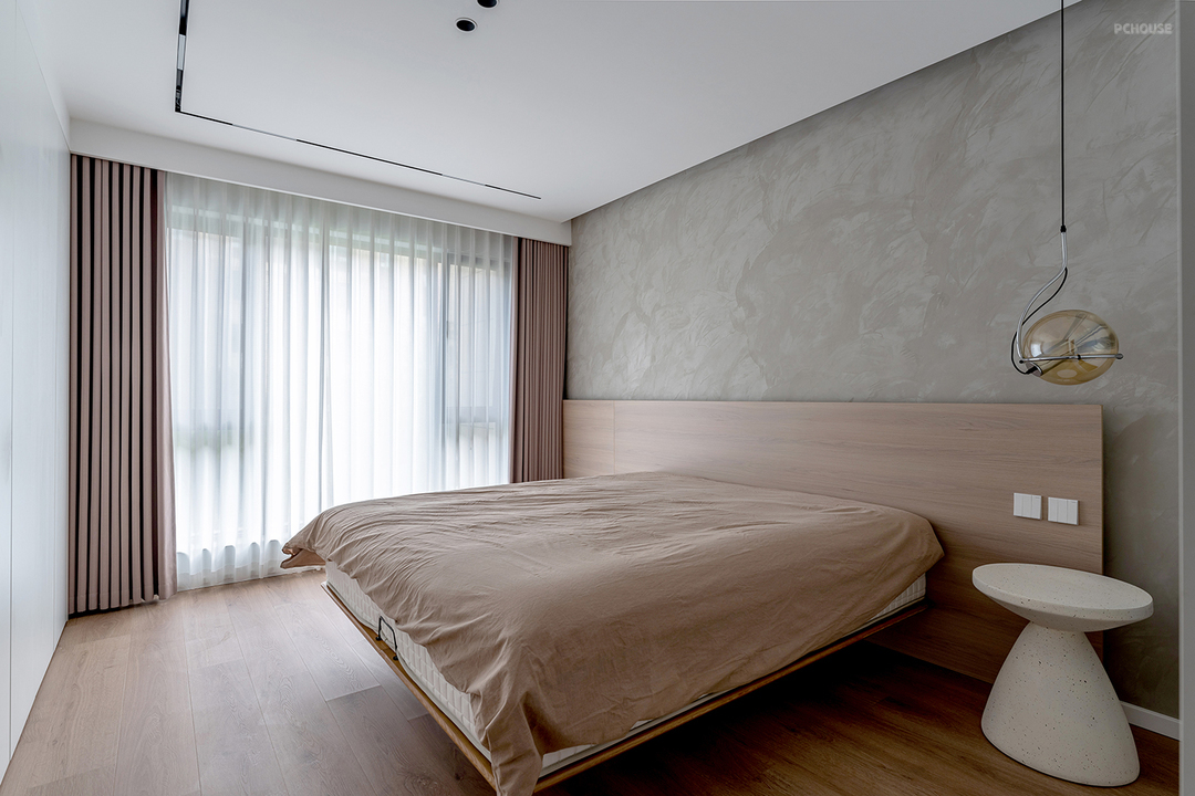 卧室床头背景墙,选用更具艺术感的水泥漆,其自然随机墙面肌理,赋予空间一种原始的细腻感。无床头设计,使用原木的护墙板做半墙拼接,也让空间视觉感拉长,房间更显大。