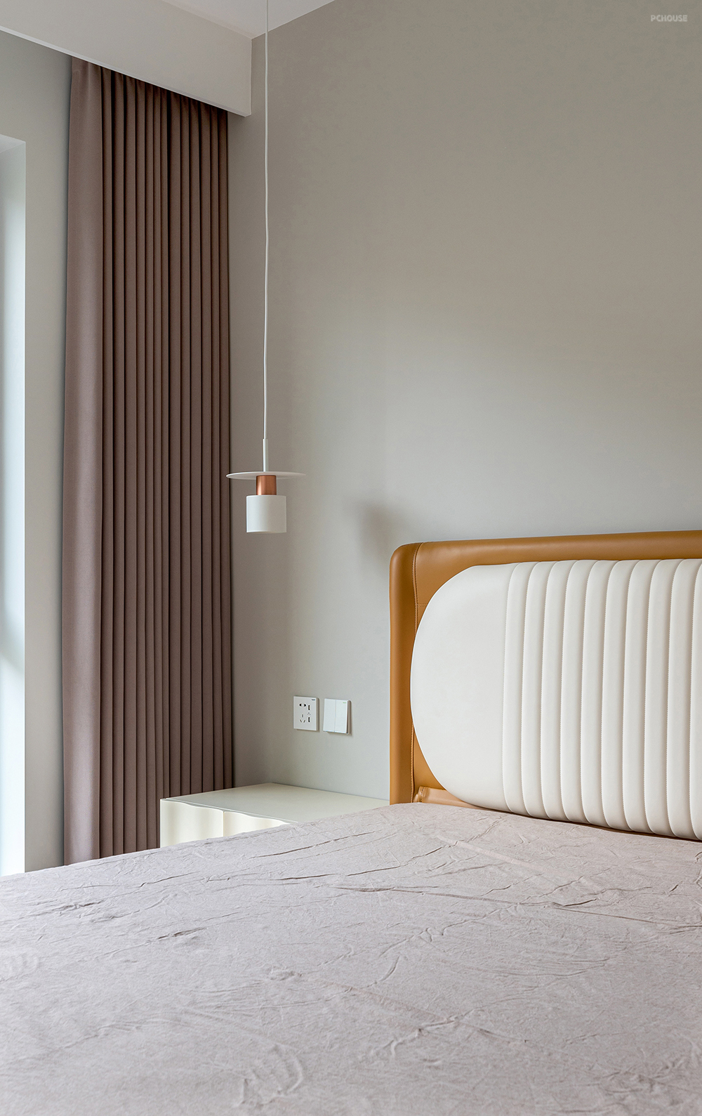 老人房选用一张意式的极简真皮床,乳白色软包+黄牛皮靠背做床头,温润有质感。