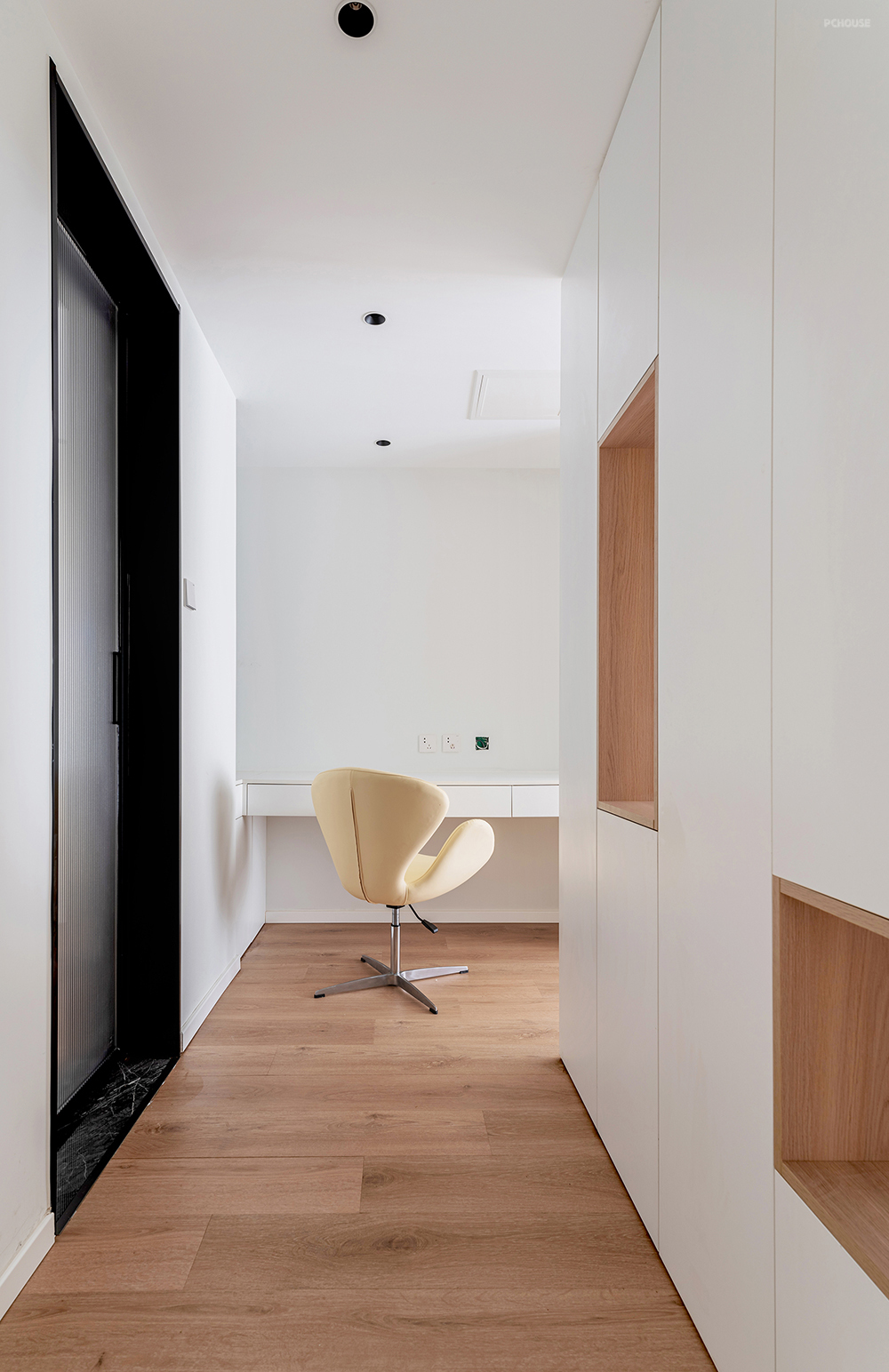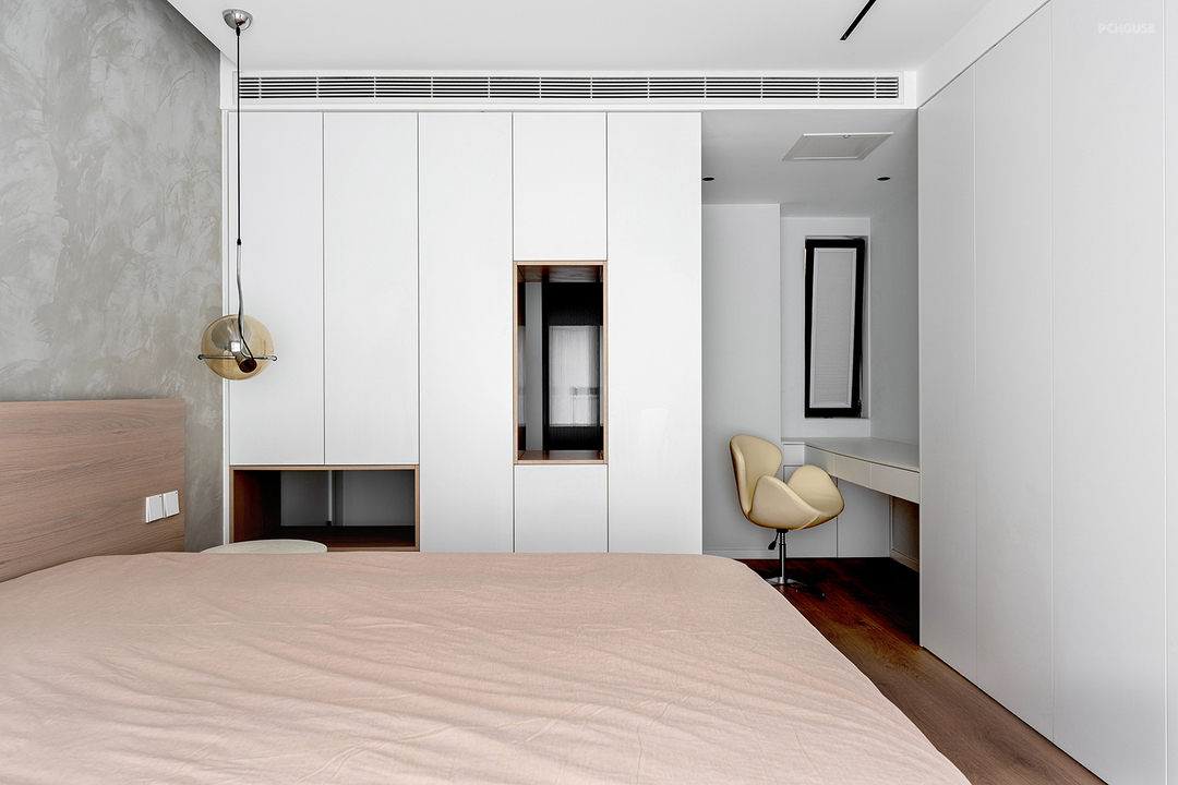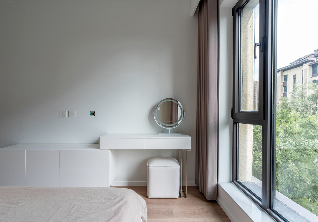 卧室由隔断柜划分内部的功能区,遮挡外部视线,可以起到私密性作用。走廊尽头放置梳妆台,1.6m的悬浮台面便于清洁打扫,左侧还保留了一扇小窗,确保梳妆角的良好采光。