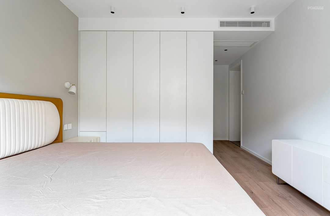床尾定制了一整排总长4.4m的衣柜,一门到顶的无把手设计,干净整洁的效果,还能提高更多的收纳空间。