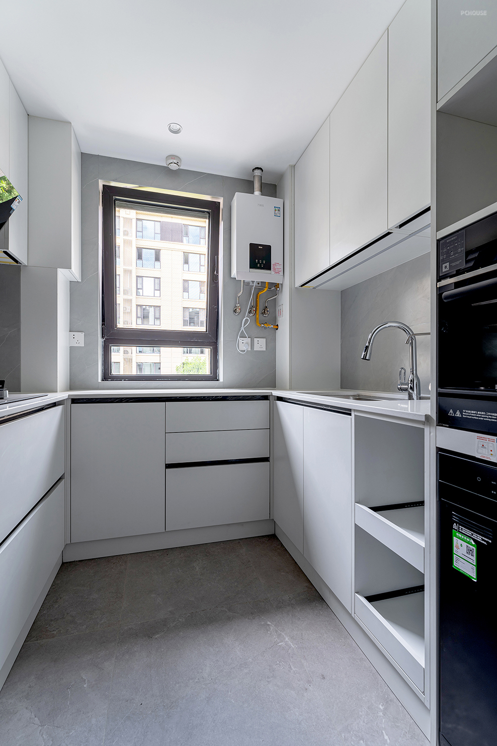 厨房采用U型布局,总长4m的橱柜,最大程度的提升台面的操作空间,满足了烹饪动线的流畅性。外侧还增加了一组嵌入式的电器柜,功能集中外观更整洁。