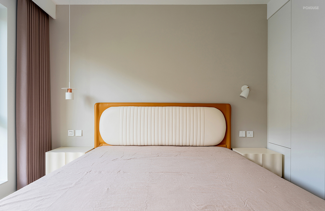 床头两侧摆放了一对奶酪色的床头柜,并用壁灯+小吊灯的组合满足局部照明,柔和不刺眼的灯光,更适合睡前使用,很温馨。