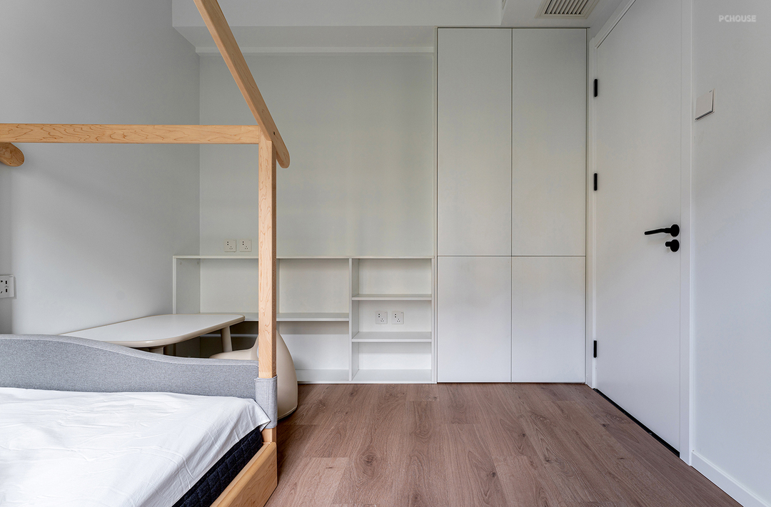 儿童房定制了一个房子造型的架子床,上方的小尖顶部分有一段横梁,可以安装吊椅荡秋千,增强趣味性。安装帘子后,还可以当作帐篷,让这个不足2㎡的区域,既可以是孩子的休息区,也可以是他自己玩耍的地方。