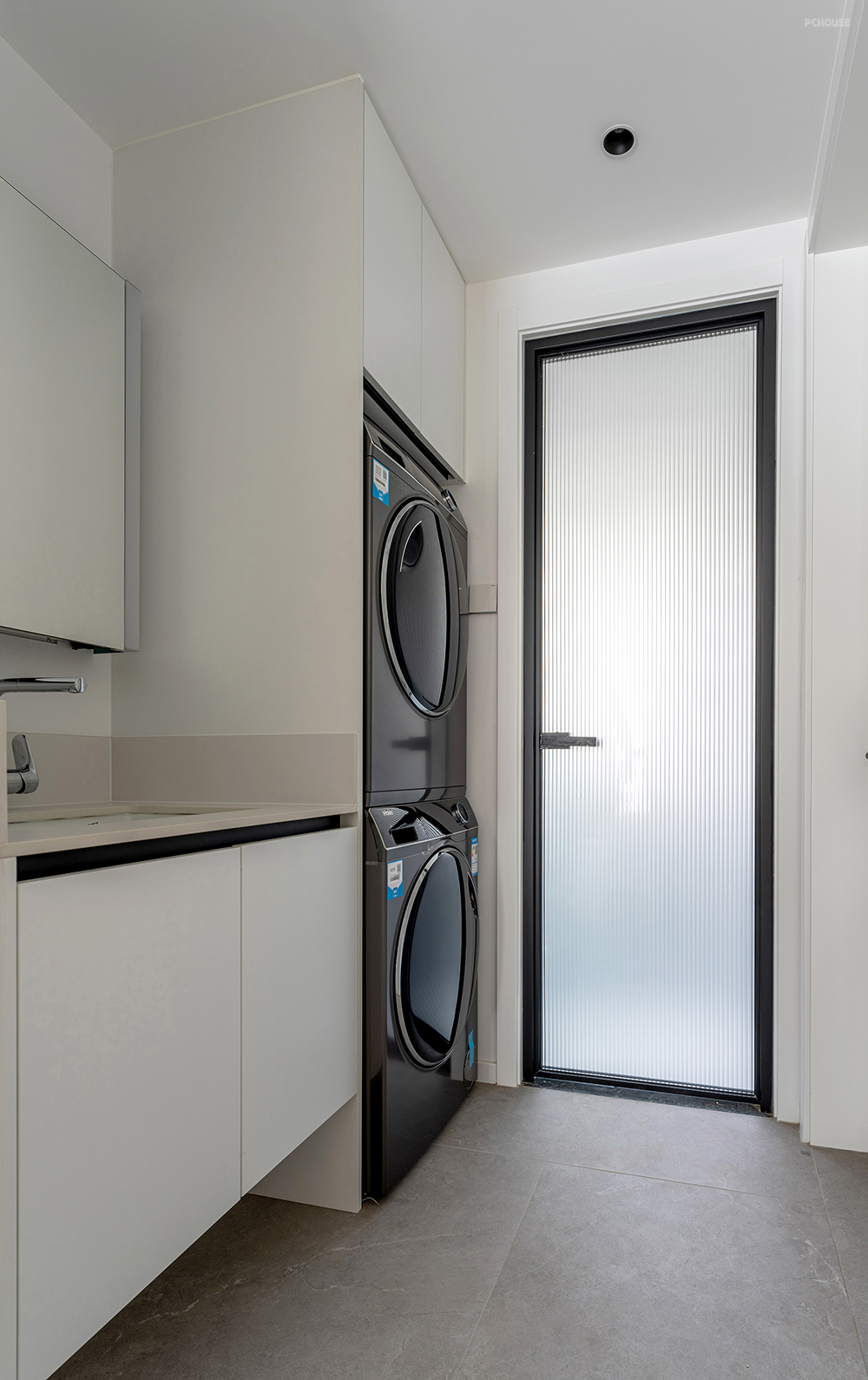 客卫将洗漱区外移做成干湿分离,80cm的洗手柜旁还增加了一组家政柜。叠放的洗烘套装,外观整洁还能节省空间的占用。