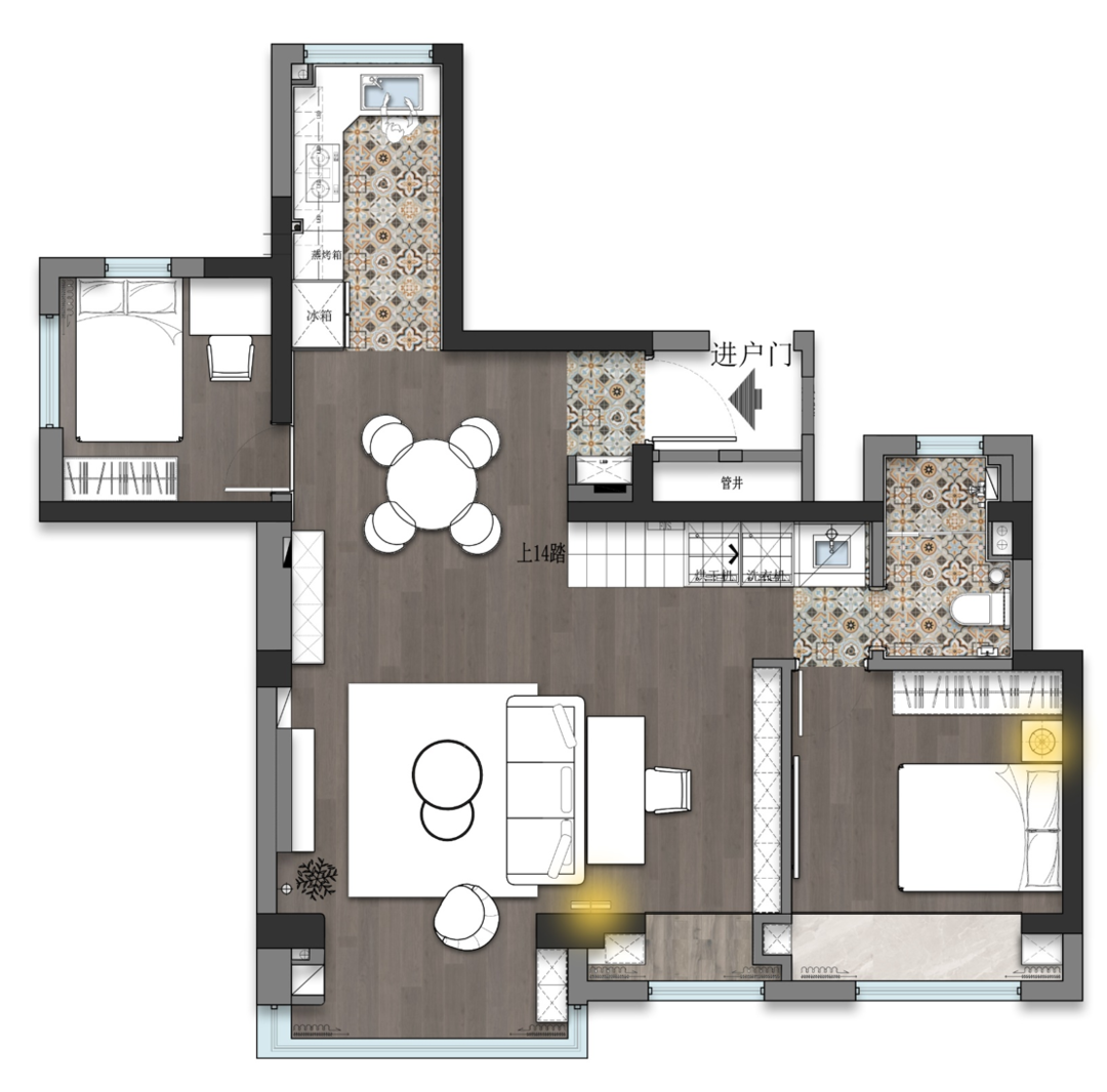 于是我们将挑高空间做了重新的规划处理,将一、二楼的空间做出了更优的分布,让可使用的功能间更多,布置方案更灵活