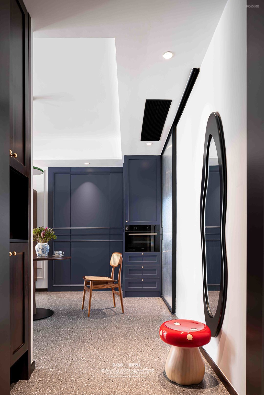 入户的第一眼就是充满复古情调感的蓝色背景墙,搭配一个活泼有趣的换鞋凳,玄关空间充满活力和生机,一侧的镜子可以在这里就能看到下一秒要享受到的情调空间,实用性和美观性同时在线
