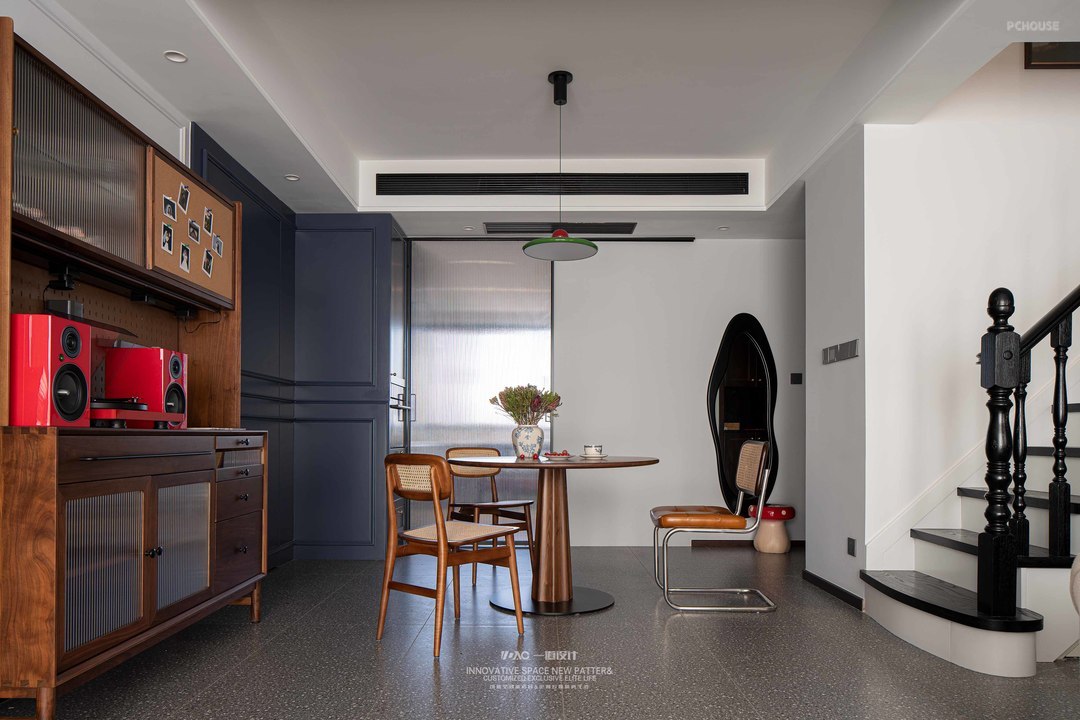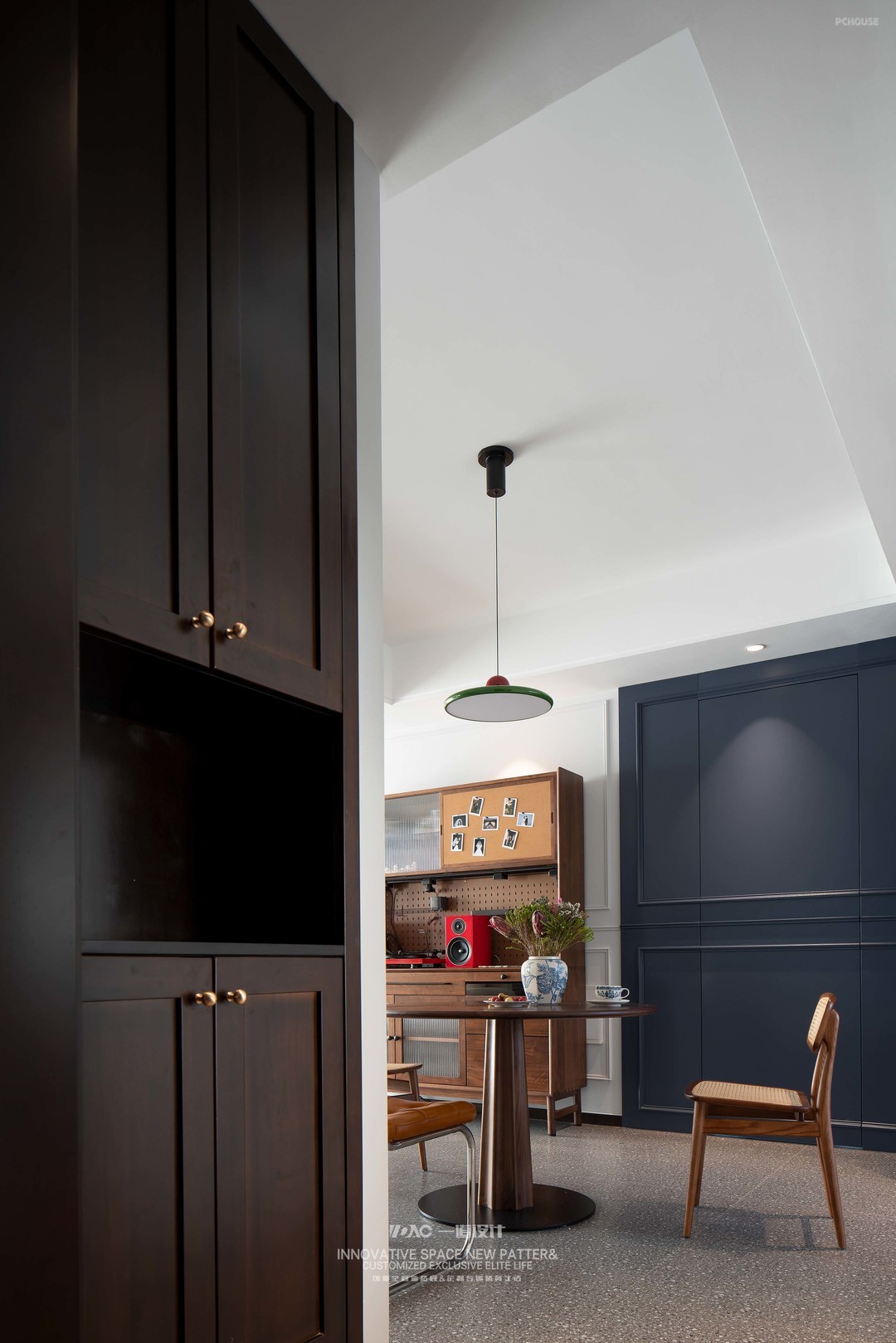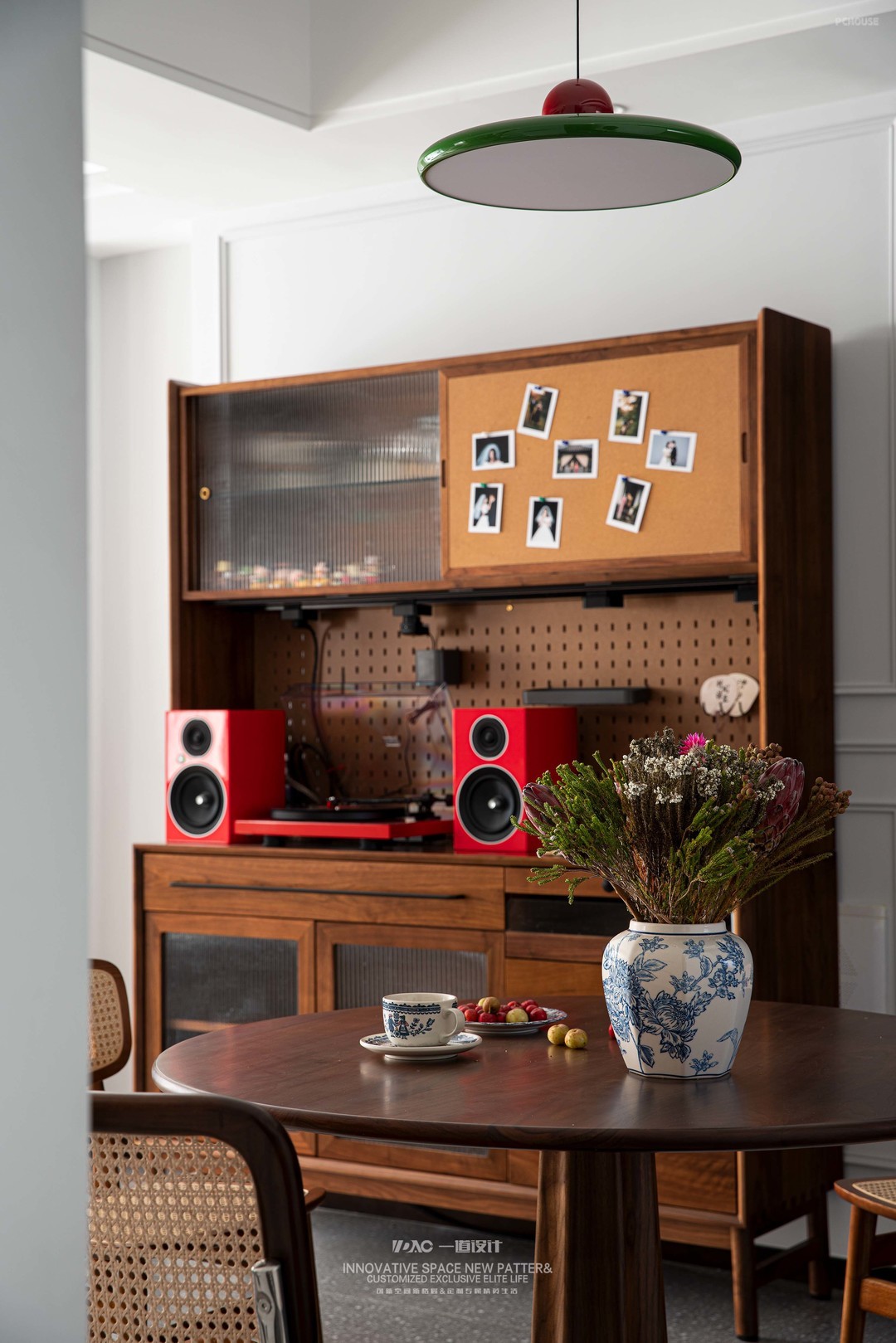 深色木质桌椅和一个餐边柜的搭配方式,首先将一个质朴又自然的情调烘托出来,不需要太多刻意的方式来衬托,照片、艳丽红色的唱片机、圆形吊灯,刻意让这里增添许多时尚感,装饰效果满满
