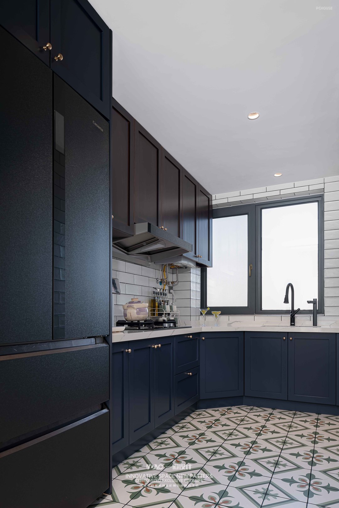 蓝色柜体与餐厅的蓝色背景墙相互呼应,达成一个略带有视觉延伸效果的表现,地面花砖的加入让厨房空间更有艺术感,精心挑选的用具也可以起到一个很好的装饰效果,生活气、烟火气、在厨房中展示对生活的热爱