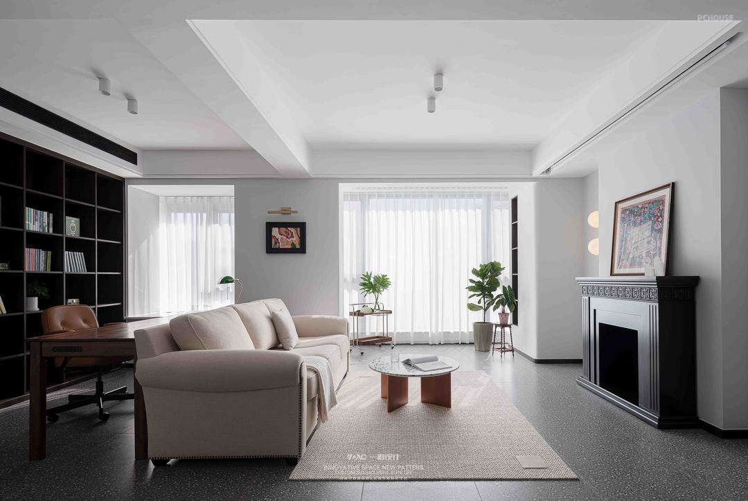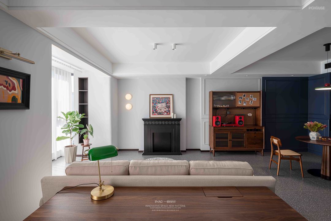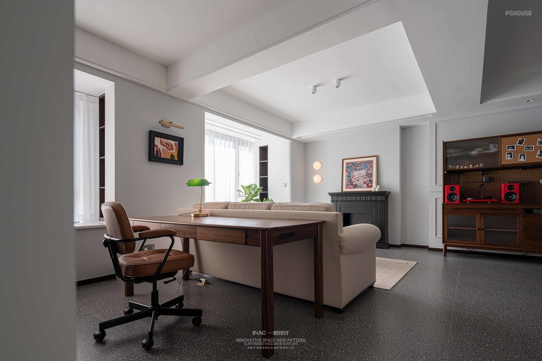 在客厅布置了巨大的书架打造一个开放的书房,沉稳而充满年代感,翠绿色台灯点缀出生机和活力,与客厅一起相辅相成,夕阳来临时暖橙色光照映射到这个位置,可以在客厅和书房中无缝切换,享受时间和生活带来的美