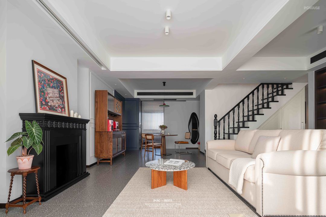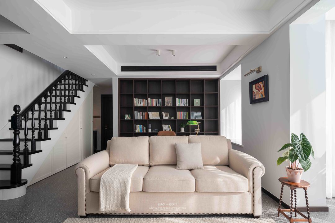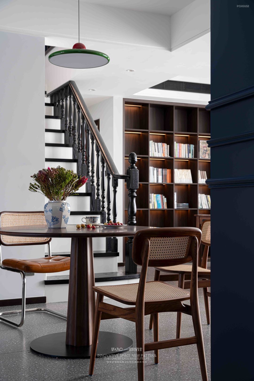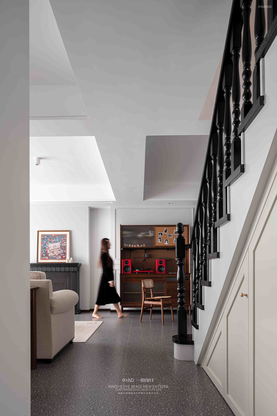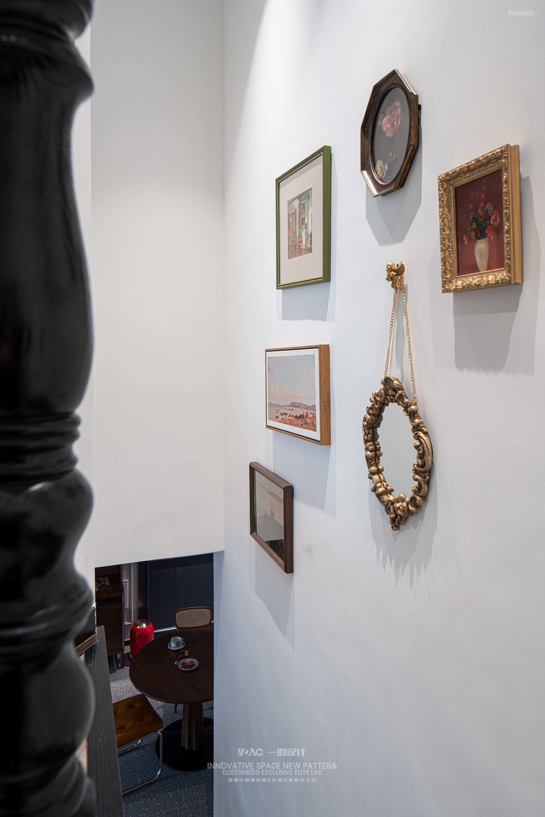 楼梯连接上与下的空间,行动过程中也应该充满美感和情调,复古造型的扶手设计在光照的补充下还能显得格外贵气,楼梯下方安排了可供放置收纳的定制柜体,楼梯墙面摆放了精心挑选的装饰挂画,这是一个充满美且使用的过渡空间