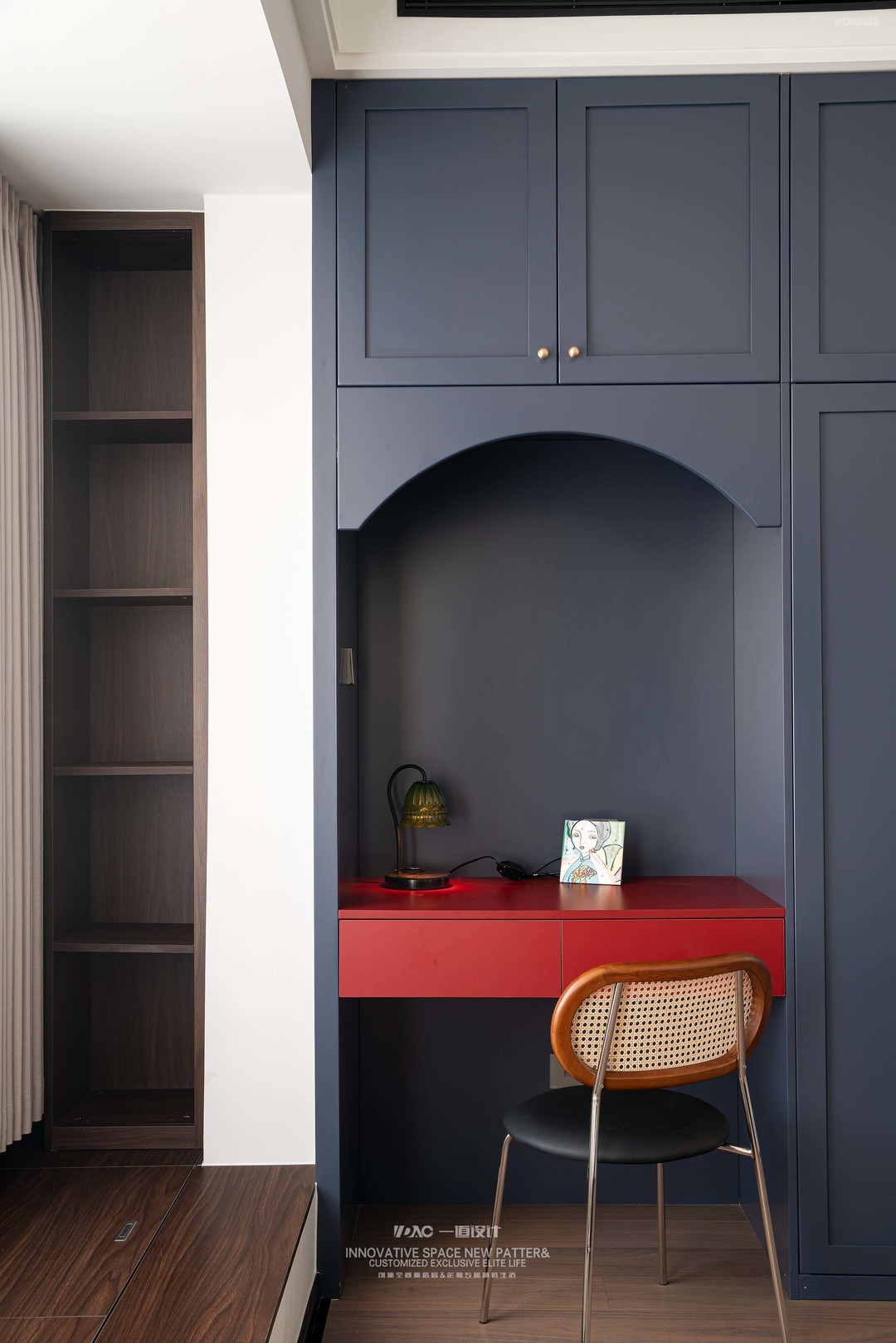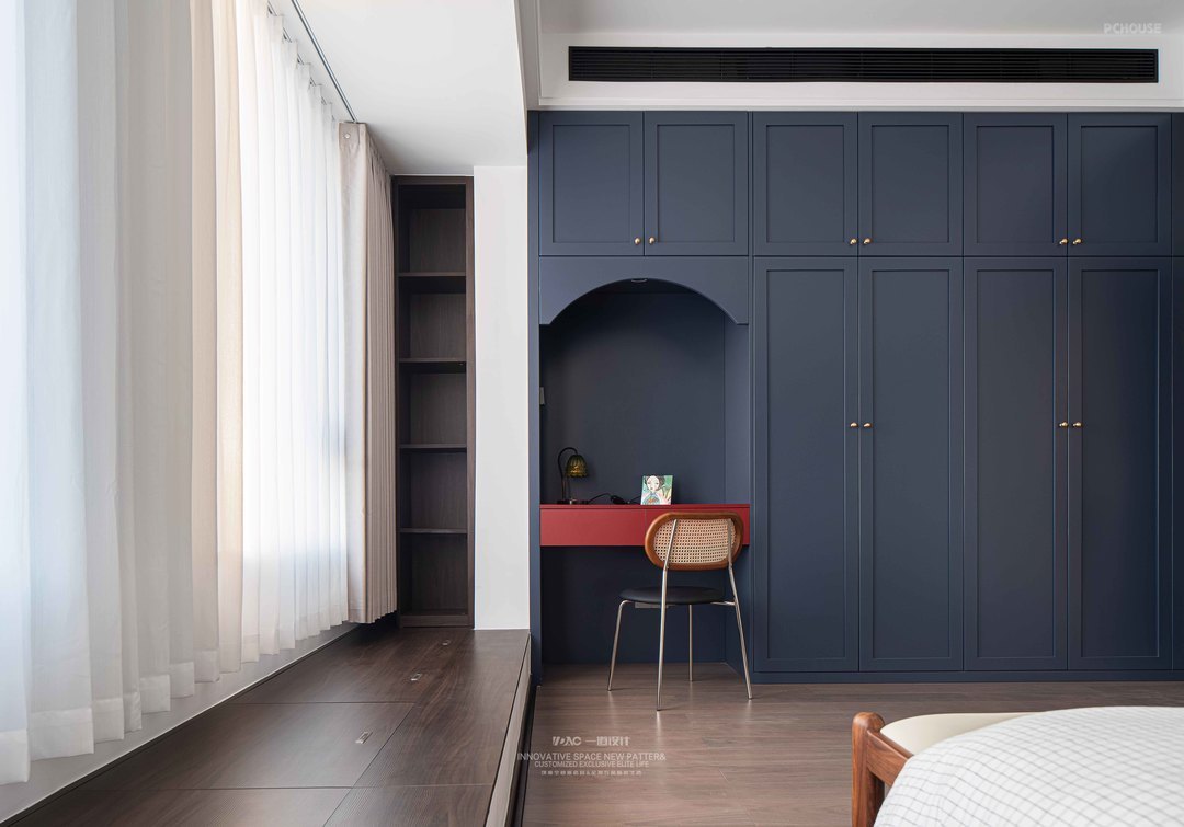 石膏线、复古样式的背景墙和衣橱衣柜,都是为了衬托出空间中的情调感,梳妆台的红色更显得独特和格调感,加入一个带有收纳功能的地台设计,无论是收纳还是铺上垫子在这里阅读或是活动,都意味着这个空间是为了感受和享受生活而打造的