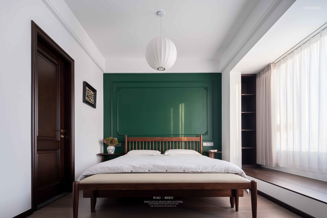 主卧配色以复古绿和蓝黑色为主基调,用绿植和装饰物做色彩与视觉效果上的碰撞,将艺术氛围和质感沉淀在这里