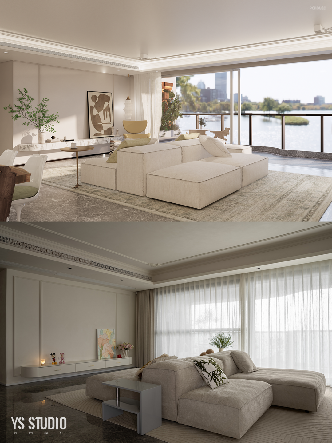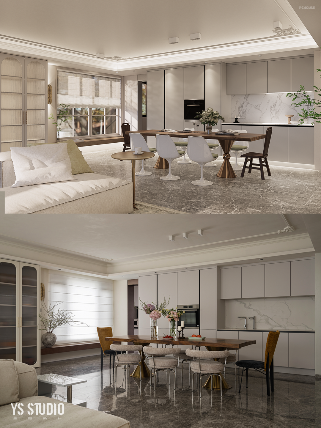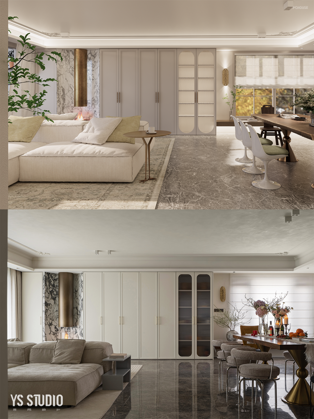 这套精装房改造,我们通过色彩搭配、材质的运用,将优雅法式的风格注入。通过一点局部背景的改造,加入了富有设计感的壁炉,柔和的柜门式样,改变了原本一板一眼的现代基调。特别是不同单椅的搭配,让整个空间都充满了复古的韵味。我们来看看设计与实景的对比图。