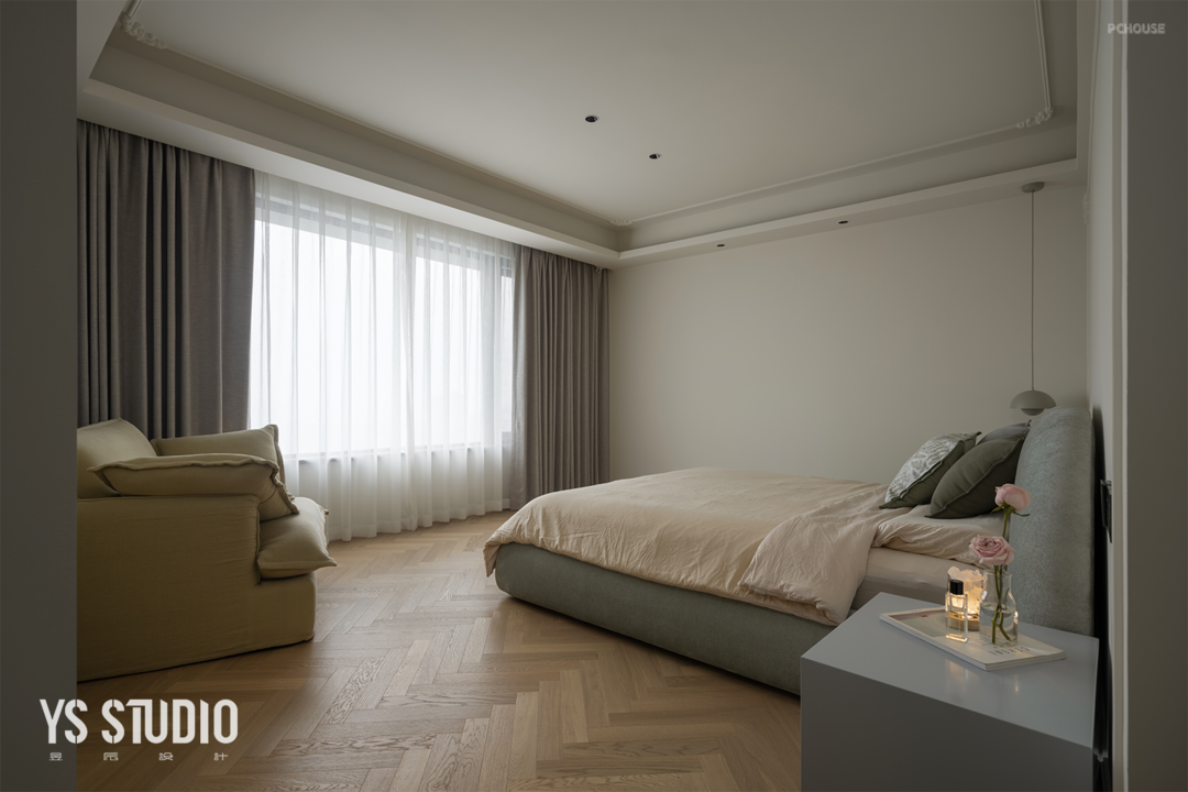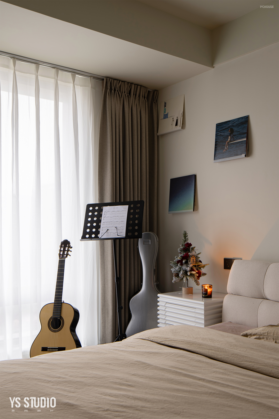 小儿子特别热爱生活中的小情趣,所以我们只用简单的色彩,归置了卧室的基本功能,其余留给居住的人自己摆摆弄弄。于是在拍摄日我们看到了吉他、照片、圣诞树,属于小儿子自己的热爱。