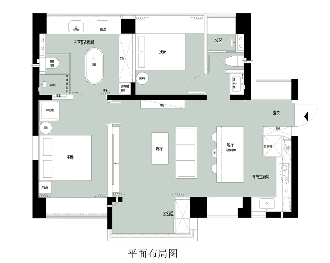 ▲布局的规划上没有设计单独的餐厅区域,而是设计了大岛台过渡厨房与客厅空间关系,不用餐桌是屋主提出来的,以后常住人员是她和她先生,布局不是千遍一律的,而是随着屋主生活方式而定。