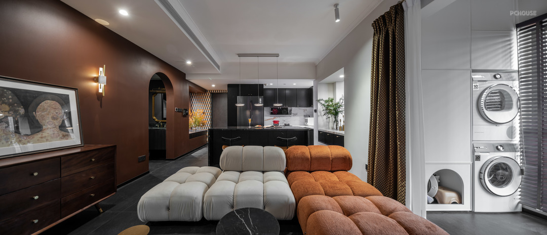 ▲整体是浓郁的红棕色与沉稳的黑色为主调,以精致的黄铜色与天然石材为点缀,整个空间色彩强烈、质感奢华、复古浪漫,再融入植物的自然气息,形成了两位摩登屋主独一无二的家。