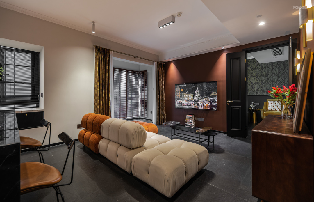 ▲客厅墙面没有过多的硬装,红棕色的墙漆搭配火烧石质感的哑光砖,给空间增加复古有调性的气质。带有金色元素的窗帘更是自带精致感。#客厅
