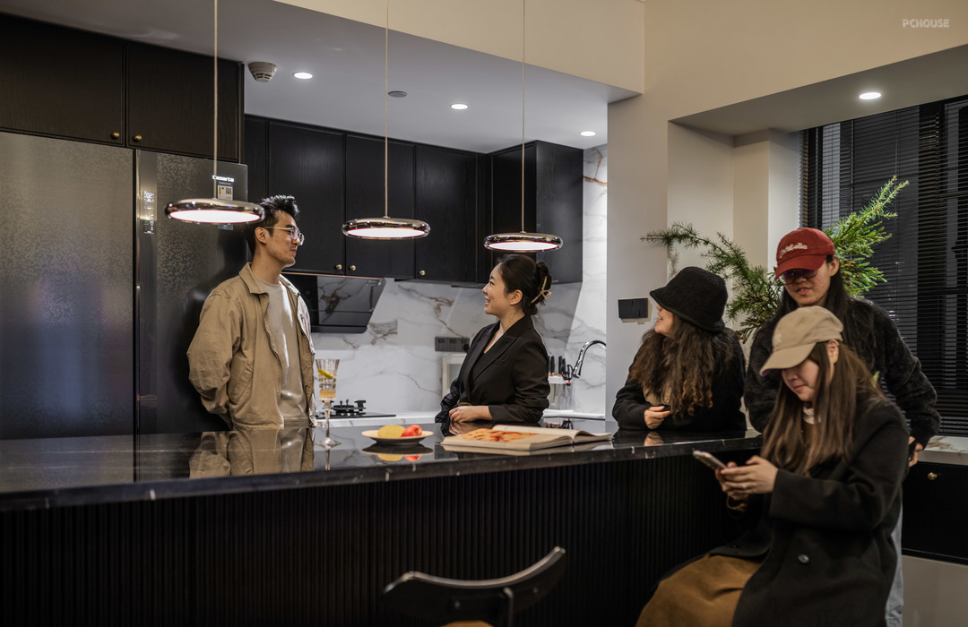 ▲厨房与岛台的色调一致,黑色柜门的开方式厨房在以后的生活日常中可以选择不同色彩的锅与餐具,对于不同色彩的加增包容性很强。