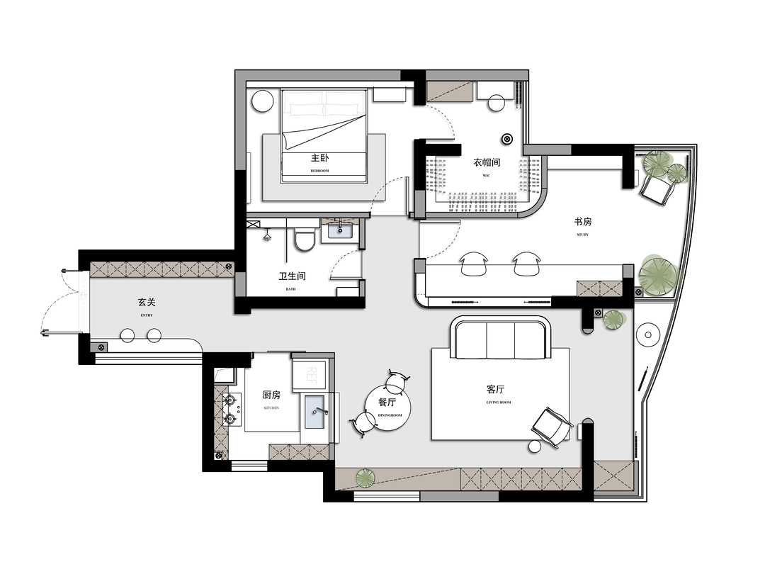 ❷ 入户、厨房、客餐厅及大卧室采光很好