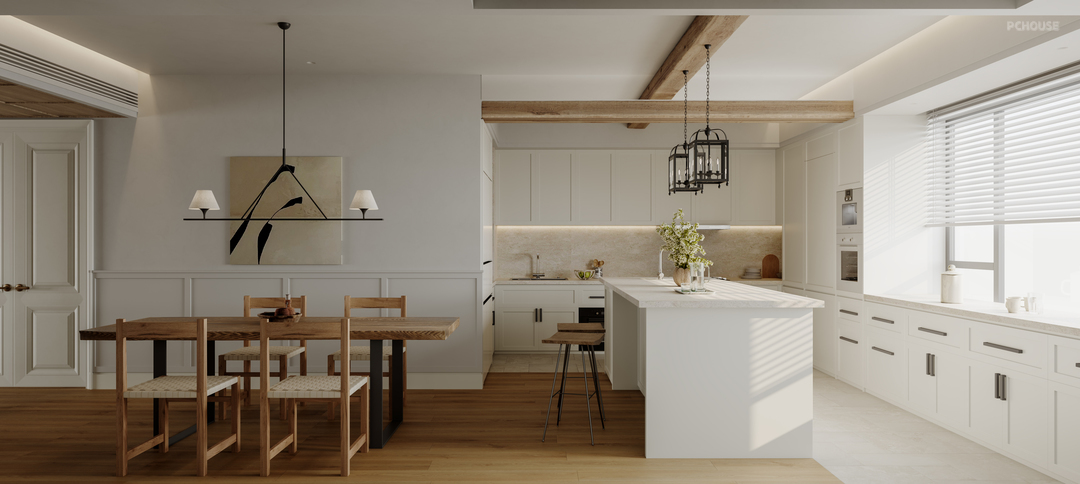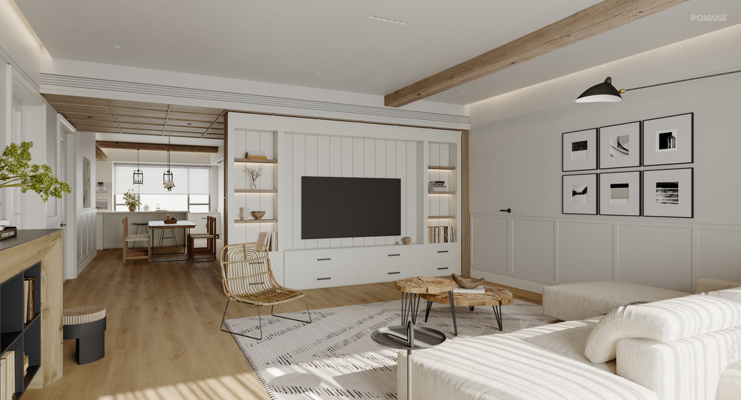 为了平衡凹阳台带来的空间感,右区设计了一款悬浮式卡座,其独特的框镜造型不仅增添了空间层次感,还让凹阳台部分呈现出一种外凸的视觉效果。客厅与阳台的交界处加入了一个假梁设计,巧妙地将两个空间串联起来。这个假梁不仅从视觉上弱化了阳台与客厅的分隔感,还增添了一份美式自然风的韵味。