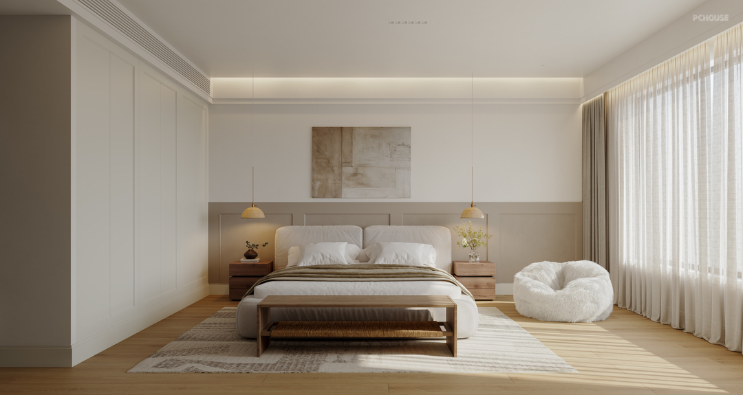 考虑到男女主人都有在家办公的需求,且办公时间可能存在重叠,主卧内特别设置了一个小书桌。这样,即便他们同时开电话会议,也不会相互干扰,确保了各自的工作效率和隐私。