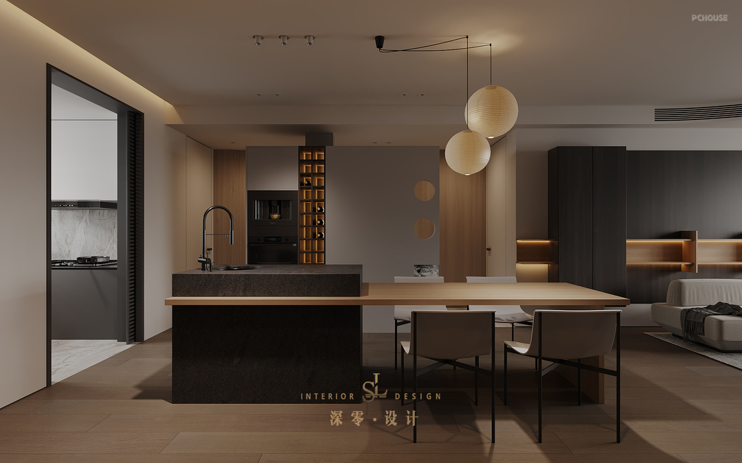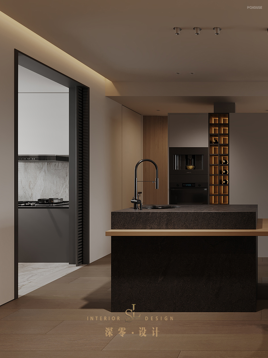 业主找到我们的时候希望打造一个静谧深色、有力量感的家,我们关注人在空间中的感受,通过线条、材质和造型的独特性,层层递进,构成不同场景下的居家情绪。