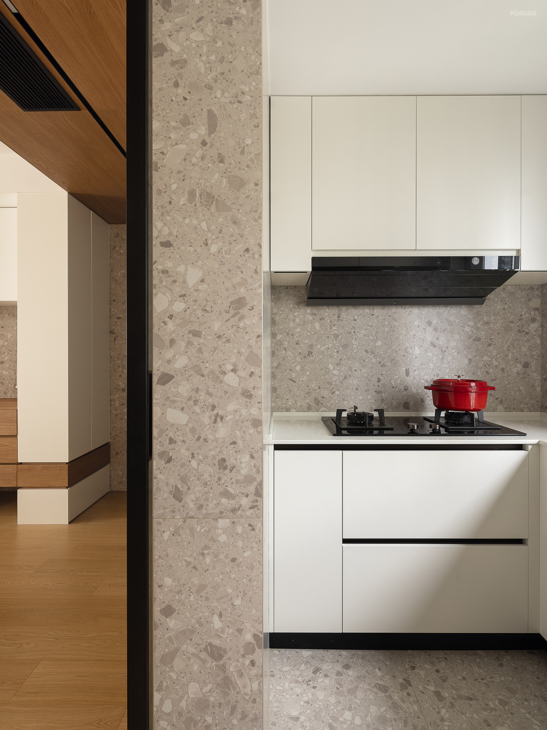 入口玄关处以木饰面衔接,空调收纳到内部,形成一个腔体。水磨石木饰面点缀立面结构的同时,延续到地面的设计切割开餐厅与玄关区域,形成自然的空间划分。