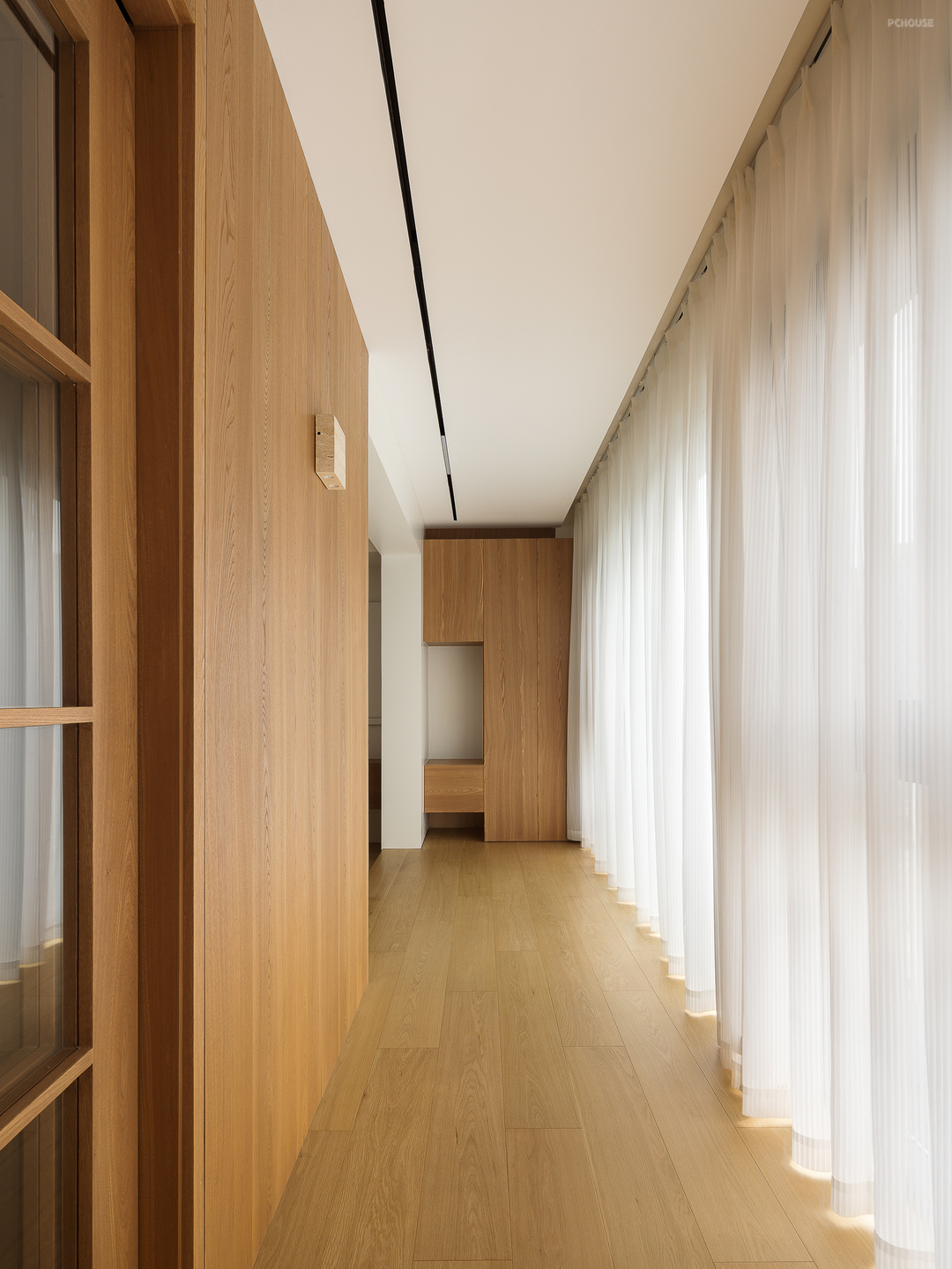 设计有意识的在木作为主的硬质空间中间加入皮质这一软性元素,使其在视觉呈现中,既有局部的松弛感又不冲破整体的规范边界。两者对标的意识形态,也象征着个人与家庭的流动关照性。